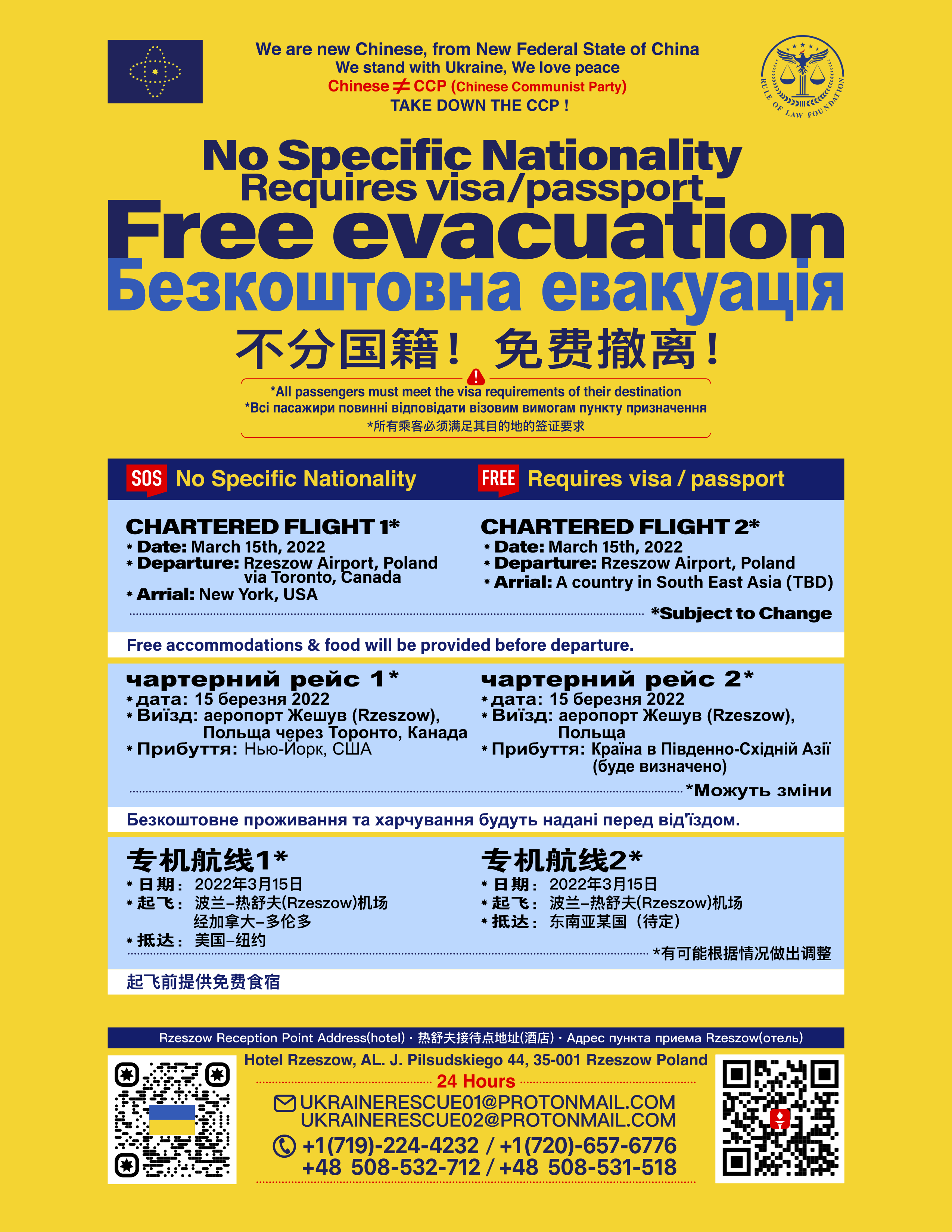 Due to the Chinese Communist Party manipulating our email service provider with the intention of disrupting our Ukraine rescue operation, the previously announced website and email address have been forcibly closed and the updated 24-hour Emergency Rescue Support Team’s contact information is as follows: