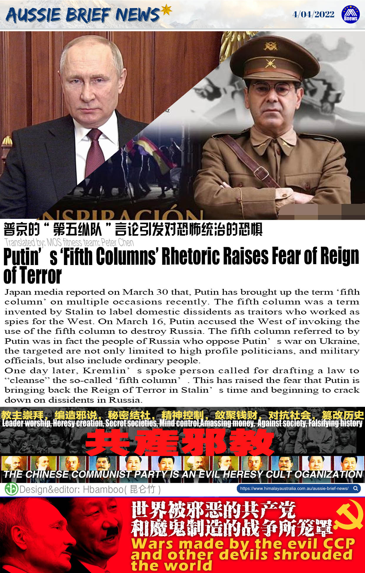 Japan media reported on March 30 that, Putin has brought up the term ‘fifth column’ on multiple occasions recently. The fifth column was a term invented by Stalin to label domestic dissidents as traitors who worked as spies for the West.
