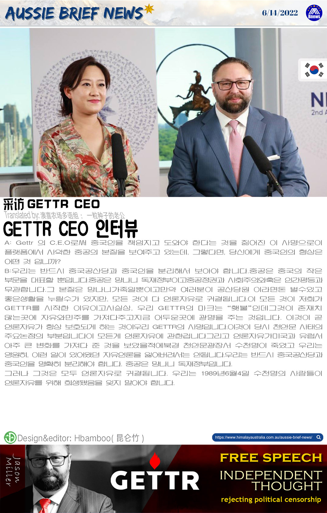 B:우리는 반드시 중국공산당과 중국인을 분리해서 보아야 합니다.중공은 중국의 작은 부문을 대표할 뿐입니다.중공은 망나니 독재정부이고중공정권과 사회주의와혹은 인간평등과 무관합니다.그 본질은 망나니가족일뿐이고만약 여러분이 공산당원 이라면돈 벌수있고 좋은생활을 누릴수가 있지만, 모든 것이 다 언론자유로 귀결됩니다.이 모든 것이 저희가 GETTR를 시작한 이유이고사실상, 우리 GETTR의 마크는 “횃불”인데그것이 존재치 않는곳에 자유와민주를 가져다주고지금 어두운곳에 광명을 주는 것입니다. 이것이 곧 언론자유가 항상 보호되게 하는 것이우리 GETTR의 사명입니다.이것이 당시 천안문 사태의 주요논점의 부분입니다이 모든게 언론자유에 관한겁니다그리고 언론자유가미국과 유럽서 아주 큰 변화를 가져다 준 것을 보았을적에북경 천안문광장서 수천명이 죽었고 우리는 영원히, 이런 일이 있어왔던 자유언론을 잃어버려서는 안됩니다.우리는 반드시 중국공산당과 중국인을 명확히 분리해야 합니다. 중공은 망나니 독재정부입니다.