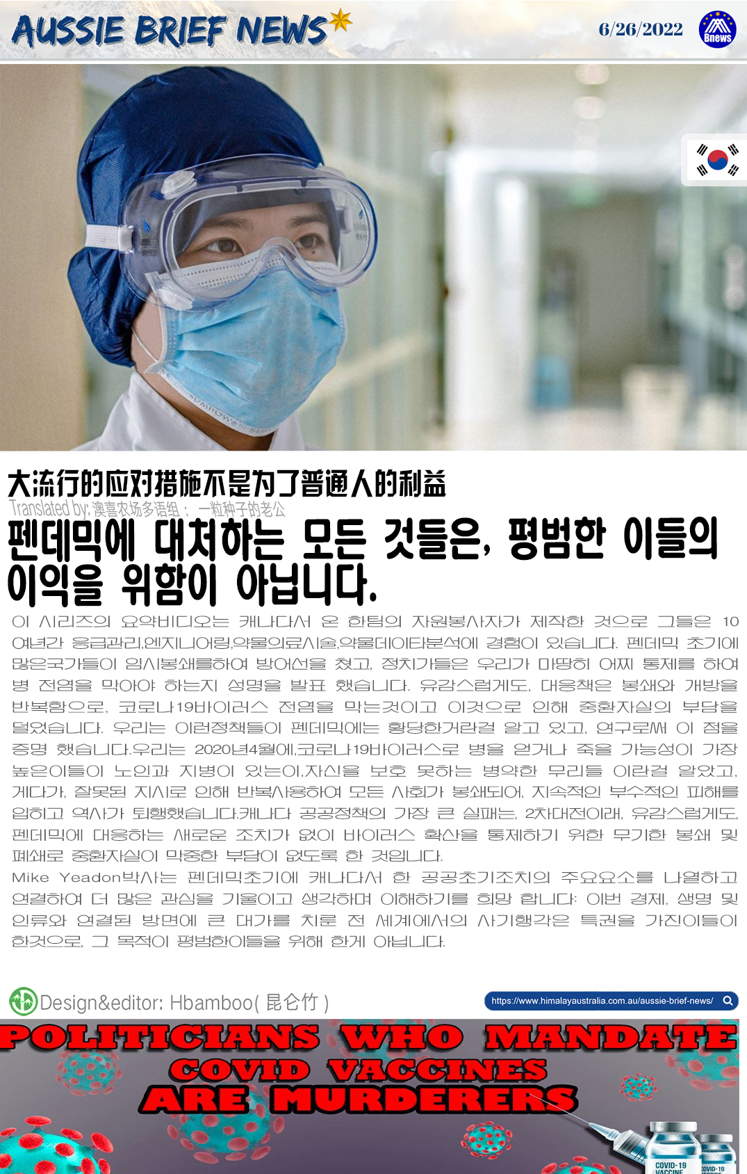 Mike Yeadon박사는 펜데믹초기에 캐나다서 한 공공초기조치의 주요요소를 나열하고 연결하여 더 많은 관심을 기울이고 생각하며 이해하기를 희망 합니다: 이번 경제, 생명 및 인류와 연결된 방면에 큰 대가를 치룬 전 세계에서의 사기행각은 특권을 가진이들이 한것으로, 그 목적이 평범한이들을 위해 한게 아닙니다.