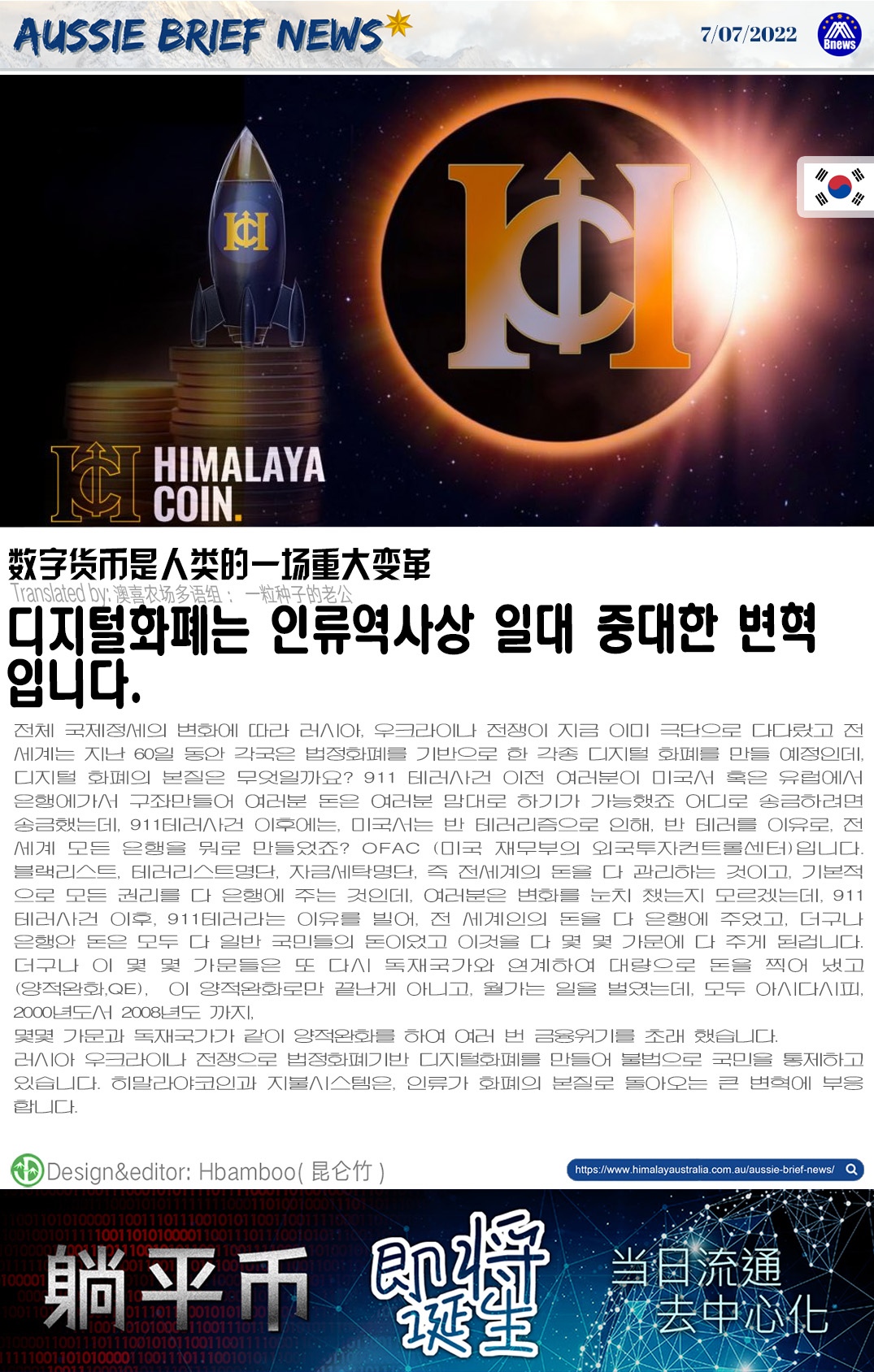 러시아 우크라이나 전쟁으로 법정화폐기반 디지털화폐를 만들어 불법으로 국민을 통제하고 있습니다. 히말라야코인과 지불시스템은, 인류가 화폐의 본질로 돌아오는 큰 변혁에 부응 합니다.