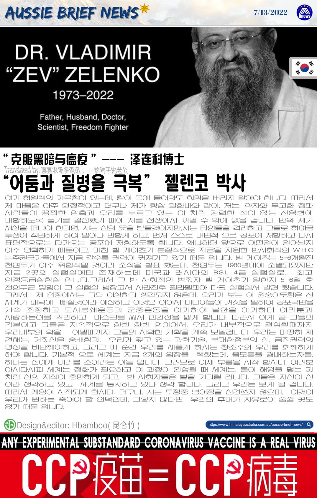 여기 하멜렉의 가르침이 있는데, 칼이 목에 들어와도 희망을 버리지 말아야 합니다. 따라서 제 마음은 아주 안정적이고 더구나 제가 항상 말한바와 같이, 저는, 약자와 무고한 정파 사람들이 끔찍한 암흑과 우리를 누르고 있는 이 처럼 강력한 적이 없는 전염병에 대항하도록 돕기를 결심했기 때에 저를 전쟁에서 꺼낼 수 밖에 없을 겁니다. 만약 제가 세상을 떠나야 한다면, 저는 신의 뜻을 받들것이지만,저는 타인들을 격려하고 그들로 하여금 투쟁에 직면하게 하여 일어나 반항케 하고, 먼저 스스로 내면적 으로 공포에 저항하고 다시 표면적으로는 다가오는 공포에 저항하도록 합니다. 왜냐하면 앞으로 어떤일이 일어날지 아주 명확하기 때문이고, 미친 빌 게이츠가 본질적으로 자금을 지원한 반사회적인 W.H.O는주권국가들에서 지금 갈수록 권력이 커져가고 있기 때문 입니다. 빌 게이츠는 5-6개월전 천연두가 아주 위협적일 것이라 소식을 발표 했는데, 천연두는 1980년대에 소멸되었지만 지금 2곳의 실험실에만 존재하는데 미국과 러시아의 BSL 4급 실험실로, 최고 안정등급실험실 입니다.그래서 그 반 사회적인 범죄자 빌 게이츠가 말한지 5-6일 후 천연두균 몇명이 그 실험실 냉장고서 사라진후 필라델피아 마크 실험실서 발견 됐습니다. 그래서, 제 입장에서는 그닥 이상하다 생각되지 않은데, 우리가 보는 이 원숭이두창은 전 세계가 패닉에 빠질것이라 예상하고 이것은 이어서 미디어들이 거짓을 말하여 공포국면을 계속 조장하고 도시봉쇄운동과 군중운동을 야기하여 불안을 야기하며 여러분과 사랑하는이를 격리하고 마스크를 써서 인간성을 잃게 합니다. 따라서 이게 곧 그들의 각본이고 그들은 지속적으로 한번 한번 연이어서, 우리가 내부적으로 결심할때까지 우리내부의 악을 쫒아낼때까지 그들의 사악한 계획을 계속 보낼겁니다. 우리는 마땅히 제 견해는, 거짓신을 숭배함과, 우리가 갖고 있는 과학기술, 부패한정부의 신, 금전권력의 명성을 비난해야하고, 그리고 매 순간 우리를 새롭게 하시는 창조주와 우리를 화해하게 해야 합니다. 기본적 으로 세계는 지금 2개의 입장을 택했는데, 음모론을 경배하는자들, 하나는 신에게 머리를 조아리는 이들 입니다. 그러므로 이제 부름을 시작 합시다. 여러분 아시다시피 세계는 정화가 필요하고 이 과정이 완성될 때 세계는, 물이 해양을 덮는 것 처럼 신의 지식이 충만하게 되고, 반 사회자들은 벌을 기다릴 겁니다. 그들은 자신이 신 이라 생각하고 있고 세계를 통치하고 있다 생각 합니다. 그리고 우리는 보게 될 겁니다. 따라서 게임이 시작되게 합시다. 더구나, 저는 투쟁중 넘어짐을 신경쓰지 않으며, 이것이 우리가 원하는 죽어야 할 언덕인데, 그렇지 않다면 우리의 후대가 자유로이 숨쉴 곳도 없기 때문 입니다.