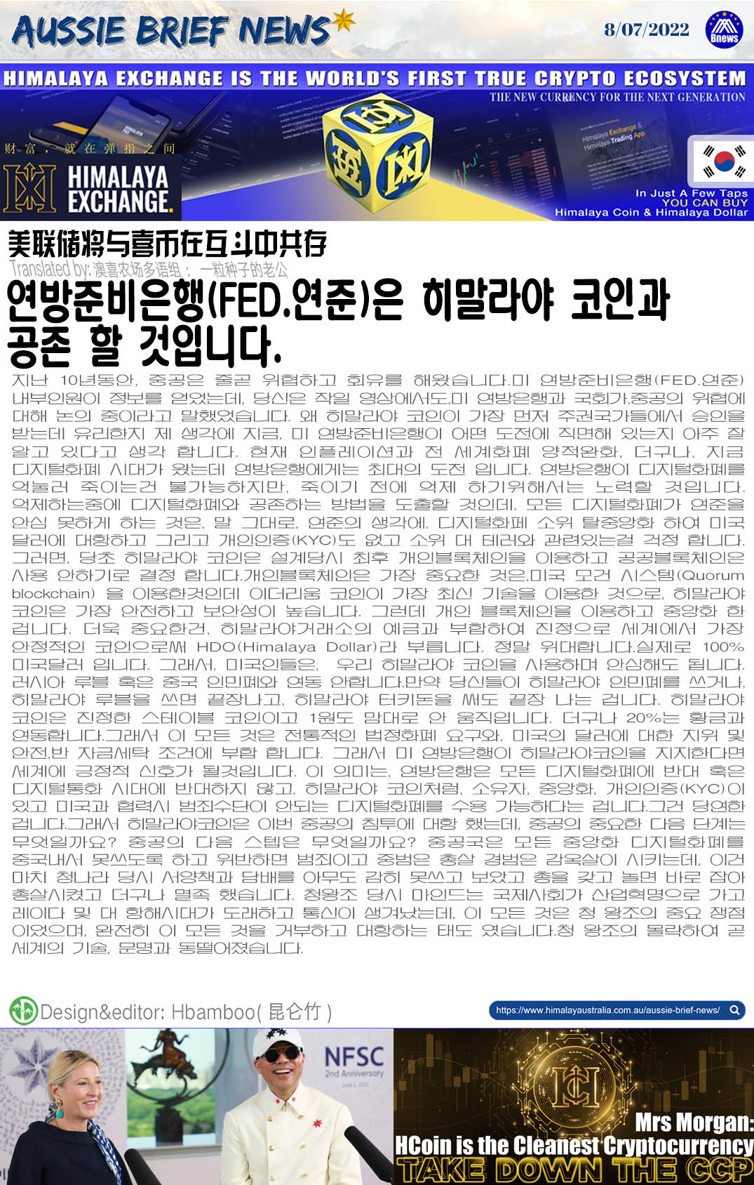 지난 10년동안, 중공은 줄곧 위협하고 회유를 해왔습니다.미 연방준비은행(FED.연준)내부인원이 정보를 얻었는데, 당신은 작일 영상에서도,미 연방은행과 국회가,중공의 위협에 대해 논의 중이라고 말했었습니다. 왜 히말라야 코인이 가장 먼저 주권국가들에서 승인을 받는데 유리한지 제 생각에 지금, 미 연방준비은행이 어떤 도전에 직면해 있는지 아주 잘 알고 있다고 생각 합니다. 현재 인플레이션과 전 세계화폐 양적완화, 더구나, 지금 디지털화폐 시대가 왔는데 연방은행에게는 최대의 도전 입니다. 연방은행이 디지털화폐를 억눌러 죽이는건 불가능하지만, 죽이기 전에 억제 하기위해서는 노력할 것입니다.억제하는중에 디지털화폐와 공존하는 방법을 도출할 것인데, 모든 디지털화폐가 연준을 안심 못하게 하는 것은, 말 그대로, 연준의 생각에, 디지털화페 소위 탈중앙화 하여 미국 달러에 대항하고 그리고 개인인증(KYC)도 없고 소위 대 테러와 관련있는걸 걱정 합니다. 그러면, 당초 히말라야 코인은 설계당시 최후 개인블록체인을 이용하고 공공블록체인은 사용 안하기로 결정 합니다.개인블록체인은 가장 중요한 것은,미국 모건 시스템(Quorum blockchain) 을 이용한것인데 이더리움 코인이 가장 최신 기술을 이용한 것으로, 히말라야 코인은 가장 안전하고 보안성이 높습니다. 그런데 개인 블록체인을 이용하고 중앙화 한 겁니다. 더욱 중요한건, 히말라야거래소의 예금과 부합하여 진정으로 세계에서 가장 안정적인 코인으로써 HDO(Himalaya Dollar)라 부릅니다. 정말 위대합니다.실제로 100% 미국달러 입니다. 그래서, 미국인들은, 우리 히말라야 코인을 사용하며 안심해도 됩니다. 러시아 루블 혹은 중국 인민폐와 연동 안합니다.만약 당신들이 히말라야 인민폐를 쓰거나, 히말라야 루블을 쓰면 끝장나고, 히말라야 터키돈을 써도 끝장 나는 겁니다. 히말라야 코인은 진정한 스테이블 코인이고 1원도 맘대로 안 움직입니다. 더구나 20%는 황금과 연동합니다.그래서 이 모든 것은 전통적인 법정화폐 요구와, 미국의 달러에 대한 지위 및 안전,반 자금세탁 조건에 부합 합니다. 그래서 미 연방은행이 히말라야코인을 지지한다면 세계에 긍정적 신호가 될것입니다. 이 의미는, 연방은행은 모든 디지털화폐에 반대 혹은 디지털통화 시대에 반대하지 않고, 히말라야 코인처럼, 소유자, 중앙화, 개인인증(KYC)이 있고 미국과 협력시 범죄수단이 안되는 디지털화폐를 수용 가능하다는 겁니다.그건 당연한 겁니다.그래서 히말라야코인은 이번 중공의 침투에 대항 했는데, 중공의 중요한 다음 단계는 무엇일까요? 중공의 다음 스텝은 무엇일까요? 중공국은 모든 중앙화 디지털화폐를 중국내서 못쓰도록 하고 위반하면 범죄이고 중범은 총살 경범은 감옥살이 시키는데, 이건 마치 청나라 당시 서양책과 담배를 아무도 감히 못쓰고 보았고 총을 갖고 놀면 바로 잡아 총살시켰고 더구나 멸족 했습니다. 청왕조 당시 마인드는 국제사회가 산업혁명으로 가고 레이다 및 대 항해시대가 도래하고 통신이 생겨났는데, 이 모든 것은 청 왕조의 중요 쟁점 이었으며, 완전히 이 모든 것을 거부하고 대항하는 태도 였습니다.청 왕조의 몰락하여 곧 세계의 기술, 문명과 동떨어졌습니다.