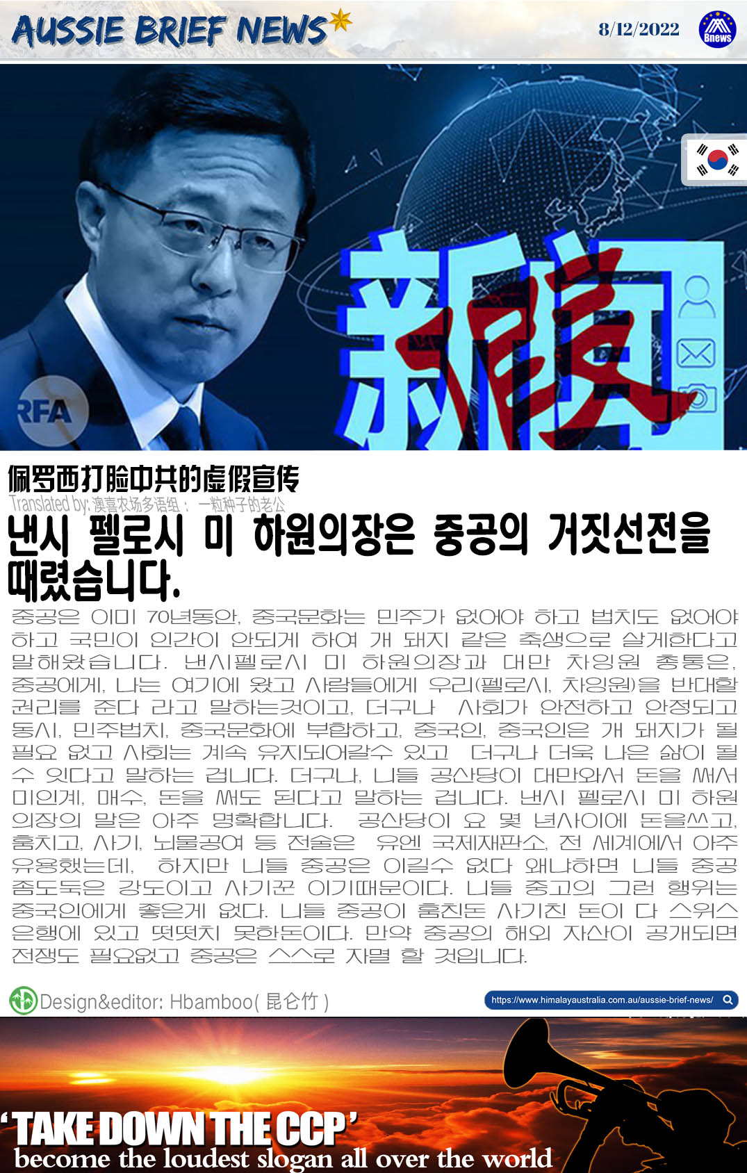 중공은 이미 70년동안, 중국문화는 민주가 없어야 하고 법치도 없어야 하고 국민이 인간이 안되게 하여 개 돼지 같은 축생으로 살게한다고 말해왔습니다. 낸시펠로시 미 하원의장과 대만 차잉원 총통은, 중공에게, 나는 여기에 왔고 사람들에게 우리(펠로시, 차잉원)을 반대할 권리를 준다 라고 말하는것이고, 더구나 사회가 안전하고 안정되고 동시, 민주법치, 중국문화에 부합하고, 중국인, 중국인은 개 돼지가 될 필요 없고 사회는 계속 유지되어갈수 있고 더구나 더욱 나은 삶이 될 수 잇다고 말하는 겁니다. 더구나, 니들 공산당이 대만와서 돈을 써서 미인계, 매수, 돈을 써도 된다고 말하는 겁니다. 낸시 펠로시 미 하원 의장의 말은 아주 명확합니다. 공산당이 요 몇 년사이에 돈을쓰고, 훔치고, 사기, 뇌물공여 등 전술은 유엔 국제재판소, 전 세계에서 아주 유용했는데, 하지만 니들 중공은 이길수 없다 왜냐하면 니들 중공 좀도둑은 강도이고 사기꾼 이기때문이다. 니들 중고의 그런 행위는 중국인에게 좋은게 없다. 니들 중공이 훔친돈 사기친 돈이 다 스위스 은행에 있고 떳떳치 못한돈이다. 만약 중공의 해외 자산이 공개되면 전쟁도 필요없고 중공은 스스로 자멸 할 것입니다.
