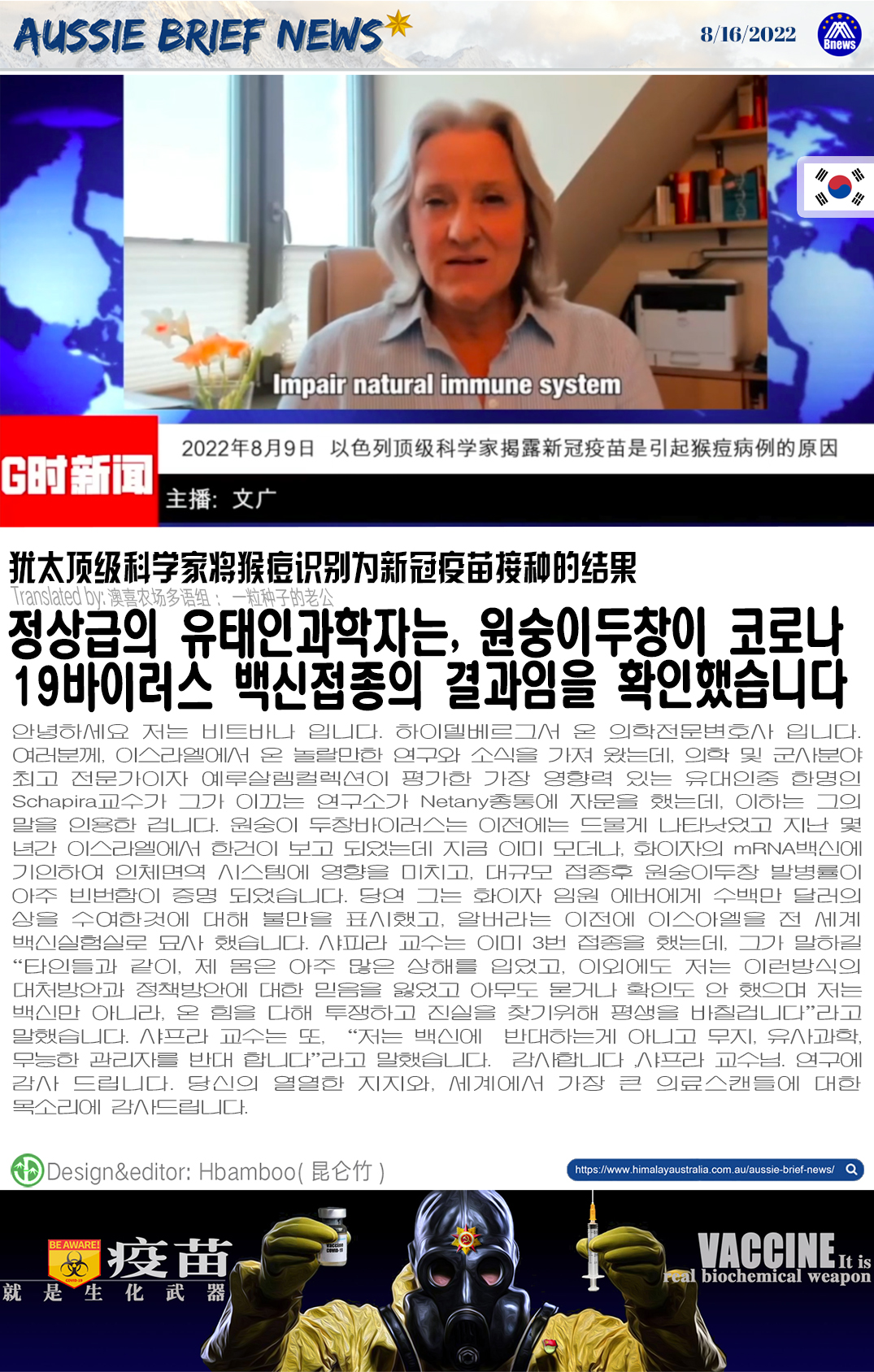 안녕하세요 저는 비트바나 입니다. 하이델베르그서 온 의학전문변호사 입니다. 여러분께, 이스라엘에서 온 놀랄만한 연구와 소식을 가져 왔는데, 의학 및 군사분야 최고 전문가이자 예루살렘컬렉션이 평가한 가장 영향력 있는 유대인중 한명인 Schapira교수가 그가 이끄는 연구소가 Netany총통에 자문을 했는데, 이하는 그의 말을 인용한 겁니다. 원숭이 두창바이러스는 이전에는 드물게 나타낫었고 지난 몇 년간 이스라엘에서 한건이 보고 되었는데 지금 이미 모더나, 화이자의 mRNA백신에 기인하여 인체면역 시스템에 영향을 미치고, 대규모 접종후 원숭이두창 발병률이 아주 빈번함이 증명 되었습니다. 당연 그는 화이자 임원 에버에게 수백만 달러의 상을 수여한것에 대해 불만을 표시했고, 알버라는 이전에 이스아엘을 전 세계 백신실험실로 묘사 했습니다. 샤피라 교수는 이미 3번 접종을 했는데, 그가 말하길 “타인들과 같이, 제 몸은 아주 많은 상해를 입었고, 이외에도 저는 이런방식의 대처방안과 정책방안에 대한 믿음을 잃었고 아무도 묻거나 확인도 안 했으며 저는 백신만 아니라, 온 힘을 다해 투쟁하고 진실을 찾기위해 평생을 바칠겁니다”라고 말했습니다. 샤프라 교수는 또, “저는 백신에 반대하는게 아니고 무지, 유사과학, 무능한 관리자를 반대 합니다”라고 말했습니다. 감사합니다 ,샤프라 교수님. 연구에 감사 드립니다. 당신의 열열한 지지와, 세계에서 가장 큰 의료스캔들에 대한 목소리에 감사드립니다.