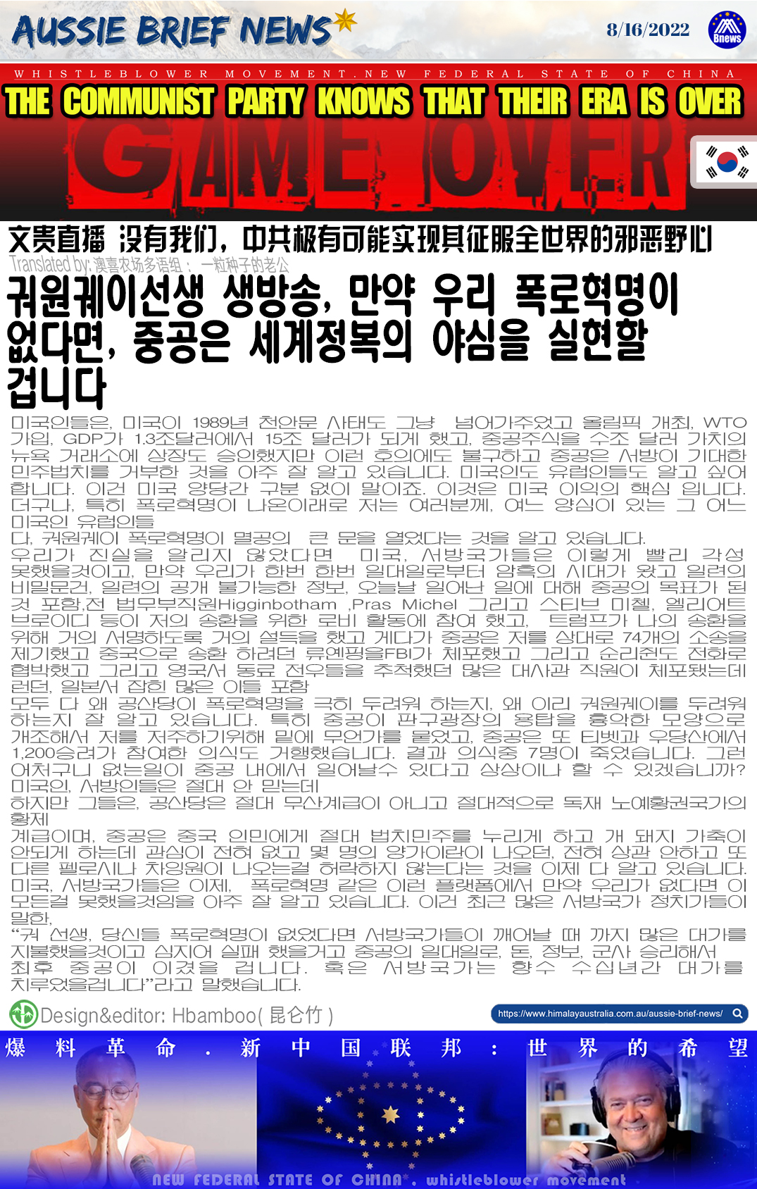 계급이며, 중공은 중국 인민에게 절대 법치민주를 누리게 하고 개 돼지 가축이 안되게 하는데 관심이 전혀 없고 몇 명의 양가이란이 나오던, 전혀 상관 안하고 또 다른 펠로시나 차잉원이 나오는걸 허락하지 않는다는 것을 이제 다 알고 있습니다. 미국, 서방국가들은 이제, 폭로혁명 같은 이런 플랫폼에서 만약 우리가 없다면 이 모든걸 못했을것임을 아주 잘 알고 있습니다. 이건 최근 많은 서방국가 정치가들이 말한, “궈 선생, 당신들 폭로혁명이 없었다면 서방국가들이 깨어날 때 까지 많은 대가를 지불했을것이고 심지어 실패 했을거고 중공의 일대일로, 돈, 정보, 군사 승리해서최후 중공이 이겼을 겁니다. 혹은 서방국가는 향수 수십년간 대가를 치루었을겁니다”라고 말했습니다.”