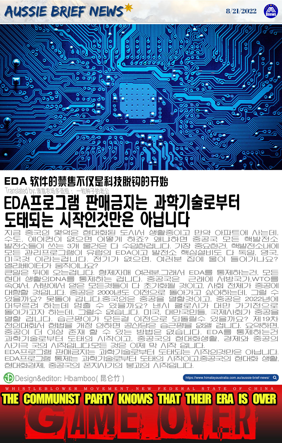 큰일은 뒤에 오는겁니다. 형제자매 여러분,그래서 EDA를 통제하는건, 모든 현대 생활의DNA를 통제하는 겁니다. 중공국은 근래에 서방국가,WTO를 속여서, 서방에서 얻은 모든것들이 다 초기화될 것이고, 사회 전체가 중공에 대항할 것입니다. 중공은 2000년도 이전으로 돌아가고 싶어하는데, 그럴 수 있을까요? 못돌아 갑니다.중국인은 중공을 멸할것이고, 중공은 2022년에 머무르려 하는데 멈출 수 있을까요? 낸시 팰로시가 대만 가기전으로 돌아가고자 하는데, 그럴수 없습니다. 미국, 대만국민들, 국제사회가 중공을 멸할 겁니다. 습근평이가 모든걸 이전으로 되돌릴수 있을까요? 제19차 전인대회서 헌법을 개정 안하면 공산당은 습근평을 없앨 겁니다. 요약하면, 중공이 더 이상 존재 할 수 있는 방법은 없습니다. EDA를 통제하는건 과학기술로부터 도태의 시작이고, 중공국의 현대화생활, 경제와 중공의 사기극 국의 시작입니다.모든 것은 이제 막 시작 입니다.