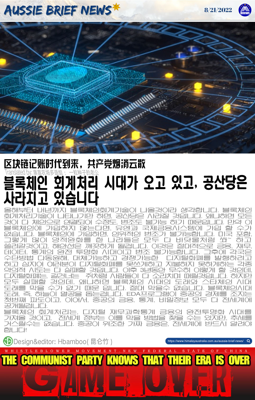 블록체인 회계처리는, 디지털 재무과학통계 금융의 완전투명화 시대를 가져올 것이고, 전세계 정부는 이를 막을 방법을 찾을 수는 있지만, 추세를 거스릴수는 없습니다. 중공이 위조한 가짜 금융은, 전세계에 반드시 알려야 합니다!