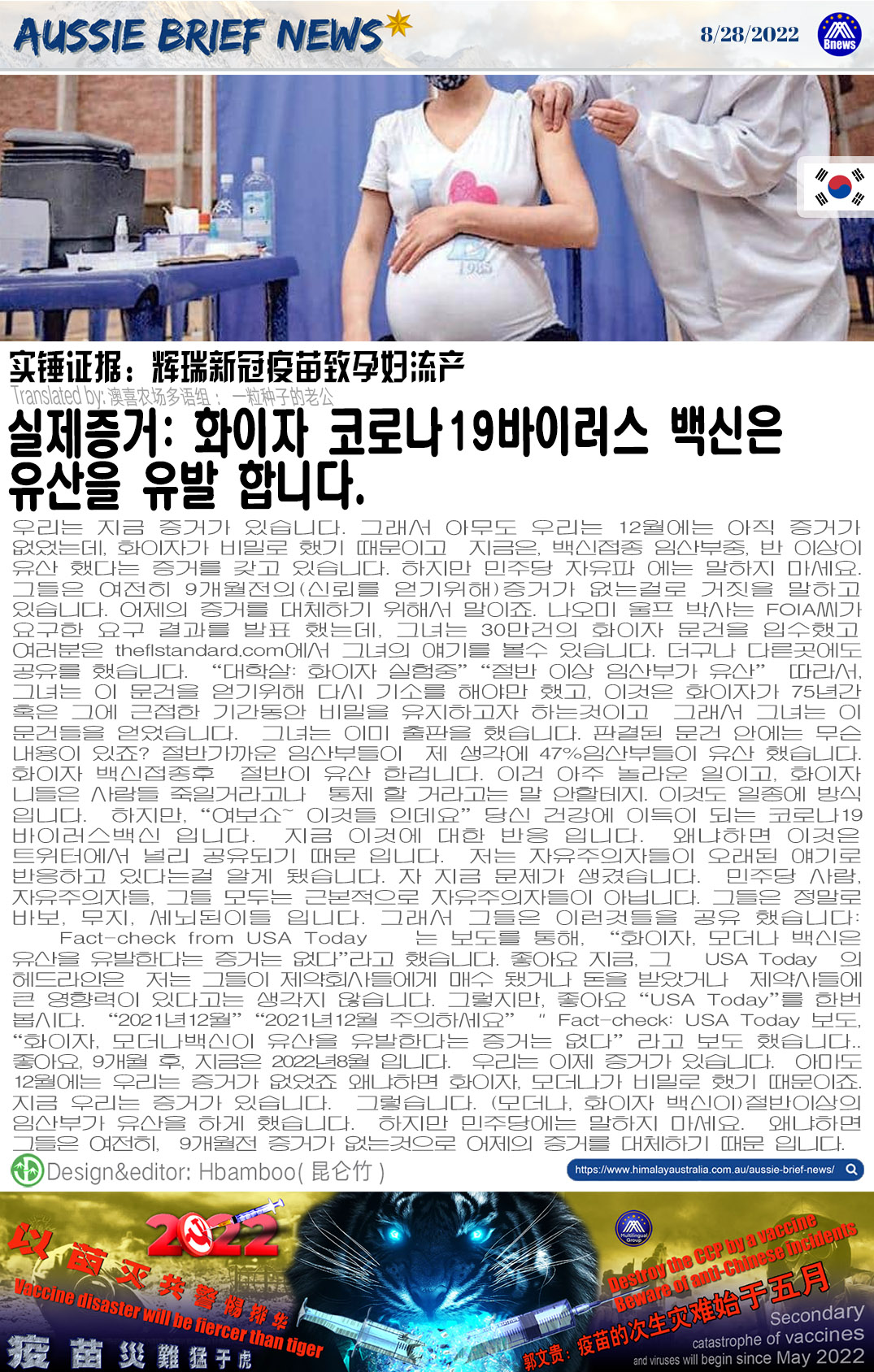 우리는 지금 증거가 있습니다. 그래서 아무도 우리는 12월에는 아직 증거가 없었는데, 화이자가 비밀로 했기 때문이고 지금은, 백신접종 임산부중, 반 이상이 유산 했다는 증거를 갖고 있습니다. 하지만 민주당 자유파 에는 말하지 마세요. 그들은 여전히 9개월전의(신뢰를 얻기위해)증거가 없는걸로 거짓을 말하고 있습니다. 어제의 증거를 대체하기 위해서 말이죠. 나오미 울프 박사는 FOIA씨가 요구한 요구 결과를 발표 했는데, 그녀는 30만건의 화이자 문건을 입수했고 여러분은 theflstandard.com에서 그녀의 얘기를 볼수 있습니다. 더구나 다른곳에도 공유를 했습니다. “대학살: 화이자 실험중” “절반 이상 임산부가 유산” 따라서, 그녀는 이 문건을 얻기위해 다시 기소를 해야만 했고, 이것은 화이자가 75년간 혹은 그에 근접한 기간동안 비밀을 유지하고자 하는것이고 그래서 그녀는 이 문건들을 얻었습니다. 그녀는 이미 출판을 했습니다. 판결된 문건 안에는 무슨 내용이 있죠? 절반가까운 임산부들이 제 생각에 47%임산부들이 유산 했습니다. 화이자 백신접종후 절반이 유산 한겁니다. 이건 아주 놀라운 일이고, 화이자 니들은 사람들 죽일거라고나 통제 할 거라고는 말 안할테지. 이것도 일종에 방식 입니다. 하지만, “여보쇼~ 이것들 인데요” 당신 건강에 이득이 되는 코로나19바이러스백신 입니다. 지금 이것에 대한 반응 입니다. 왜냐하면 이것은 트위터에서 널리 공유되기 때문 입니다. 저는 자유주의자들이 오래된 얘기로 반응하고 있다는걸 알게 됐습니다. 자 지금 문제가 생겼습니다. 민주당 사람, 자유주의자들, 그들 모두는 근본적으로 자유주의자들이 아닙니다. 그들은 정말로 바보, 무지, 세뇌된이들 입니다. 그래서 그들은 이런것들을 공유 했습니다: ˈˈFact-check from USA Todayˈˈ는 보도를 통해, “화이자, 모더나 백신은 유산을 유발한다는 증거는 없다”라고 했습니다. 좋아요 지금, 그 «USA Today»의 헤드라인은 저는 그들이 제약회사들에게 매수 됐거나 돈을 받았거나 제약사들에 큰 영향력이 있다고는 생각지 않습니다. 그렇지만, 좋아요 “USA Today”를 한번 봅시다. “2021년12월” “2021년12월 주의하세요” ” Fact-check: USA Today 보도, “화이자, 모더나백신이 유산을 유발한다는 증거는 없다” 라고 보도 했습니다.. 좋아요, 9개월 후, 지금은 2022년8월 입니다. 우리는 이제 증거가 있습니다. 아마도 12월에는 우리는 증거가 없었죠 왜냐하면 화이자, 모더나가 비밀로 했기 때문이죠. 지금 우리는 증거가 있습니다. 그렇습니다. (모더나, 화이자 백신이)절반이상의 임산부가 유산을 하게 했습니다. 하지만 민주당에는 말하지 마세요. 왜냐하면 그들은 여전히, 9개월전 증거가 없는것으로 어제의 증거를 대체하기 때문 입니다.