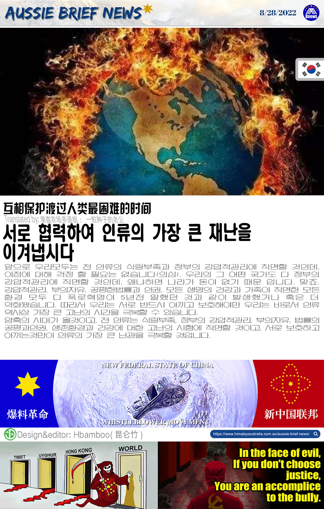 앞으로 우리모두는 전 인류의 식량부족과 정부의 강압적관리에 직면할 것인데, 이점에 대해 걱정 할 필요는 없습니다(의심). 우리의 그 어떤 국가도 다 정부의 강압적관리에 직면할 것인데, 왜냐하면 나라가 돈이 없기 때문 입니다. 맞죠. 강압적관리, 부의자유, 공평한법률과 인권, 모든 생명의 건강과 가족이 직면한 모든 환경 모두 다 폭로혁명이 5년전 말했던 것과 같이 발생했거나 혹은 더 악화됐습니다. 따라서 우리는 서로 반드시 아끼고 보호해야만 우리는 비로서 인류 역사상 가장 큰 고난의 시간을 극복할 수 있습니다.