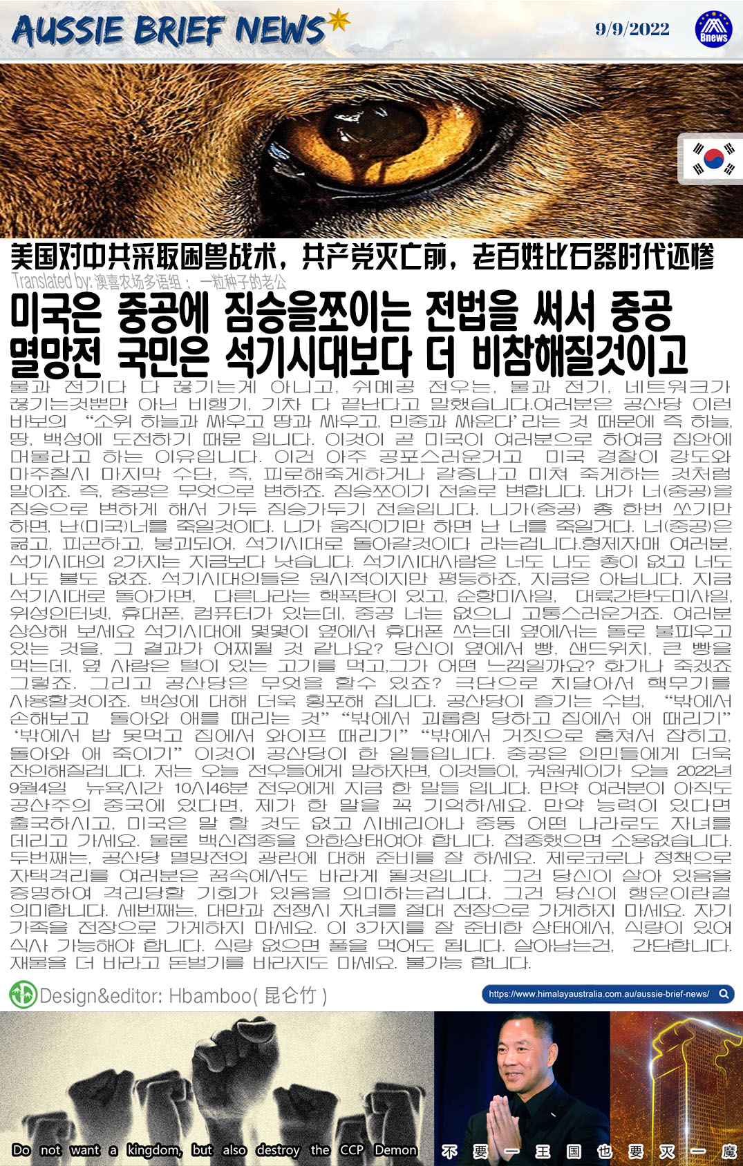 물과 전기다 다 끊기는게 아니고, 쉬몌공 전우는, 물과 전기, 네트워크가 끊기는것뿐만 아닌 비행기, 기차 다 끝난다고 말했습니다.여러분은 공산당 이런 바보의 “소위 하늘과 싸우고 땅과 싸우고, 민중과 싸운다’라는 것 때문에 즉 하늘, 땅, 백성에 도전하기 때문 입니다. 이것이 곧 미국이 여러분으로 하여금 집안에 머물라고 하는 이유입니다. 이건 아주 공포스러운거고 미국 경찰이 강도와 마주칠시 마지막 수단, 즉, 피로해죽게하거나 갈증나고 미쳐 죽게하는 것처럼 말이죠. 즉, 중공은 무엇으로 변하죠. 짐승쪼이기 전술로 변합니다. 내가 너(중공)을 짐승으로 변하게 해서 가두 짐승가두기 전술입니다. 니가(중공) 총 한번 쏘기만 하면, 난(미국)너를 죽일것이다. 니가 움직이기만 하면 난 너를 죽일거다. 너(중공)은 굶고, 피곤하고, 붕괴되어, 석기시대로 돌아갈것이다 라는겁니다.형제자매 여러분, 석기시대의 2가지는 지금보다 낫습니다. 석기시대사람은 너도 나도 총이 없고 너도 나도 불도 없죠. 석기시대인들은 원시적이지만 평등하죠, 지금은 아닙니다. 지금 석기시대로 돌아가면, 다른나라는 핵폭탄이 있고, 순항미사일, 대륙간탄도미사일, 위성인터넷, 휴대폰, 컴퓨터가 있는데, 중공 너는 없으니 고통스러운거죠. 여러분 상상해 보세요 석기시대에 몇몇이 옆에서 휴대폰 쓰는데 옆에서는 돌로 불피우고 있는 것을, 그 결과가 어찌될 것 같나요? 당신이 옆에서 빵, 샌드위치, 큰 빵을 먹는데, 옆 사람은 털이 있는 고기를 먹고,그가 어떤 느낌일까요? 화가나 죽겠죠 그렇죠. 그리고 공산당은 무엇을 할수 있죠? 극단으로 치달아서 핵무기를 사용할것이죠. 백성에 대해 더욱 횡포해 집니다. 공산당이 즐기는 수법, “밖에서 손해보고 돌아와 애를 때리는 것” “밖에서 괴롭힘 당하고 집에서 애 때리기” ‘밖에서 밥 못먹고 집에서 와이프 때리기” “밖에서 거짓으로 훔쳐서 잡히고, 돌아와 애 죽이기” 이것이 공산당이 한 일들입니다. 중공은 인민들에게 더욱 잔인해질겁니다. 저는 오늘 전우들에게 말하자면, 이것들이, 궈원궤이가 오늘 2022년9월4일 뉴욕시간 10시46분 전우에게 지금 한 말들 입니다. 만약 여러분이 아직도 공산주의 중국에 있다면, 제가 한 말을 꼭 기억하세요. 만약 능력이 있다면 출국하시고, 미국은 말 할 것도 없고 시베리아나 중동 어떤 나라로도 자녀를 데리고 가세요. 물론 백신접종을 안한상태여야 합니다. 접종했으면 소용없습니다. 두번째는, 공산당 멸망전의 광란에 대해 준비를 잘 하세요. 제로코로나 정책으로 자택격리를 여러분은 꿈속에서도 바라게 될것입니다. 그건 당신이 살아 있음을 증명하여 격리당할 기회가 있음을 의미하는겁니다. 그건 당신이 행운이란걸 의미합니다. 세번째는, 대만과 전쟁시 자녀를 절대 전장으로 가게하지 마세요. 자기 가족을 전장으로 가게하지 마세요. 이 3가지를 잘 준비한 상태에서, 식량이 있어 식사 가능해야 합니다. 식량 없으면 풀을 먹어도 됩니다. 살아남는건, 간단합니다. 재물을 더 바라고 돈벌기를 바라지도 마세요. 불가능 합니다.