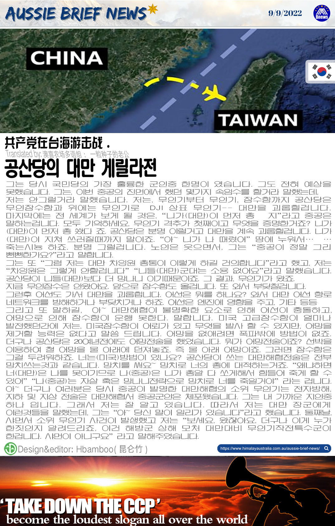 니가(대만)이 지쳐 쓰러질때까지 말이죠. “아~ 니가 나 때렸어” 땅에 누워서……죽는시늉 하죠. 분명 그럴겁니다. 노인은 웃으면서, 그는 “중공이 정말 그리 뻔뻔한가요?”라고 말합니다. 그는 또 “그럼 저는 대만 차잉원 총통이 이렇게 하길 건의합니다”라고 했고, 저는 “차잉원은 그렇게 안할겁니다” “니들(대만)군대는 소용 없어요”라고 말했습니다. 공산당이 니들(대만)보다 더 망나니 이기때문이죠. 그 결과, 무인기가 왔죠.