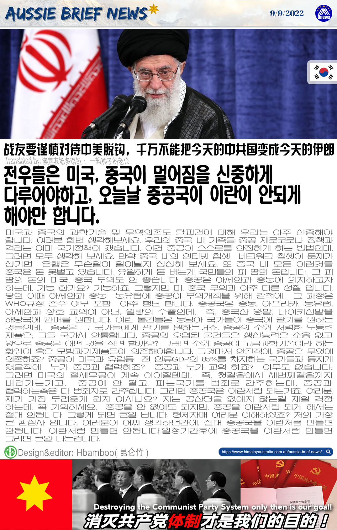 미국과 중국의 과학기술 및 무역의존도 탈피건에 대해 우리는 아주 신중해야 합니다. 여러분 한번 생각해보세요. 우리의 중국 내 가족들 중공 제로코로나 정책과 격리는 이미 국가정책이 됐습니다. 이건 중공이 스스로를 안전하게 하는 방법인데, 그러면 모두 생각해 보세요. 만약 중국 내의 인터넷 칩셋 네크워크 칩셋이 문제가 생기면 은행은 무슨일이 일어날지 상상해 보세요. 또 중국 내 모든 이런것들 중국은 돈 못벌고 있습니다. 유일하게 돈 버는게 국민들의 피 땀의 돈입니다. 그 피 땀의 돈의 미국, 중국 무역도 안 좋습니다. 중공은 아세안과 중동에 의지하고자 하는데, 가능 한가요? 가능하죠. 그렇지만 미, 중국 무역과 아주 다른 성질 입니다. 당연 이때 아세안과 중동 동유럽에 중공이 무역개척을 위해 갈적에, 그 과정은 WHO규정 준수 여부 포함 아주 험난 합니다. 중공국은 중동, 아프리카, 동유럽, 아세안과 상호 교역이 아닌, 일방의 수출인데, 즉, 중국산 양말, 나이키신발을 해당국에 판매를 원합니다. 이런 물건들은 동남아 국가들이 중국에 팔기를 원하는 것들인데, 중공은 그 국가들에게 팔기를 원하는거죠. 중공의 소위 저렴한 노동력 제품은, 그들 국가서 안통합니다. 중공의 오염된 물건들은 생산능력은 소용 없고 앞으로 중공은 어떤 것을 직면 할까요? 그러면 소위 중공이 고급과학기술이라 하는 화웨이 혹은 모방과기제품들에 의존해야합니다. 그것마저 안될적에, 중공은 무엇에 의존하죠? 중공이 미국과 유럽등 전 인류GDP의 85%를 차지하는 국가들과 등지게 됐을적에 누가 중공과 협력하죠? 중공과 누가 교역 하죠? 아무도 없습니다. 그러면 미국의 절세무공이 계속 이어질텐데, 즉, 첫걸음에서 세번째걸음까지 내려가는거고, 중공에 안 팔고, 파는국가를 범죄로 간주하는데, 중공과 협력하는측은 다 범죄자로 간주합니다. 그러면 중공국은 이란처럼 되는거죠. 여러분, 제가 가장 두려운게 뭔지 아시나요? 저는 공산당을 없애지 않는걸 제일 걱정 하는데, 꼭 기억하세요, 중공을 안 없애도 되지만, 중공을 이란처럼 되게 해서는 절대 안됩니다. 그렇게 되면 큰일 납니다. 형제자매 여러분 이해하셨죠? 저의 가장 큰 관심사 입니다. 여러분이 어찌 생각하던간에, 절대 중공국을 이란처럼 만들면 안됩니다. 이란처럼 만들면 안됩니다.일정기간후에 중공국을 이란처럼 만들면 그러면 큰일 나는겁니다.