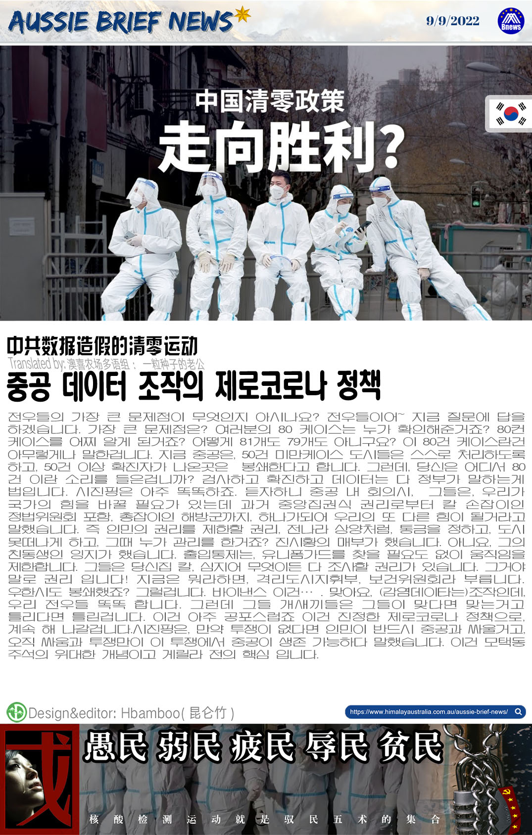 전우들의 가장 큰 문제점이 무엇인지 아시나요? 전우들이어~ 지금 질문에 답을 하겠습니다. 가장 큰 문제점은? 여러분의 80 케이스는 누가 확인해준거죠? 80컨 케이스를 어찌 알게 된거죠? 어떻게 81개도 79개도 아니구요? 이 80건 케이스란건 아무렇게나 말한겁니다. 지금 중공은, 50건 미만케이스 도시들은 스스로 처리하도록 하고, 50건 이상 확진자가 나온곳은 봉쇄한다고 합니다. 그런데, 당신은 어디서 80건 이란 소리를 들은겁니까? 검사하고 확진하고 데이터는 다 정부가 말하는게 법입니다. 시진핑은 아주 똑똑하죠. 듣자하니 중공 내 회의시, 그들은, 우리가 국가의 힘을 바꿀 필요가 있는데 과거 중앙집권식 권리로부터 칼 손잡이인 정법위원회 포함, 총잡이인 해방군까지, 하나가되어 우리의 또 다른 힘이 될거라고 말했습니다. 즉 인민의 권리를 제한할 권리, 전나라 상양처럼, 통금을 정하고, 도시 못떠나게 하고, 그때 누가 관리를 한거죠? 진시황의 매부가 했습니다. 아니요, 그의 친동생인 잉지가 했습니다. 출입통제는, 유니폼가드를 찾을 필요도 없이 움직임을 제한합니다. 그들은 당신집 칼, 심지어 무엇이든 다 조사할 권리가 있습니다. 그거야 말로 권리 입니다! 지금은 뭐라하면, 격리도시지휘부, 보건위원회라 부릅니다. 우한시도 봉쇄했죠? 그럴겁니다. 바이낸스 이건…. 맞아요, (감염데이타는)조작인데, 우리 전우들 똑똑 합니다. 그런데 그들 개새끼들은 그들이 맞다면 맞는거고 틀리다면 틀린겁니다. 이건 아주 공포스럽죠 이건 진정한 제로코로나 정책으로, 계속 해 나갈겁니다.시진핑은, 만약 투쟁이 없다면 인민이 반드시 중공과 싸울거고, 오직 싸움과 투쟁만이 이 투쟁에서 중공이 생존 가능하다 말했습니다. 이건 모택동 주석의 위대한 개념이고 게릴라 전의 핵심 입니다.