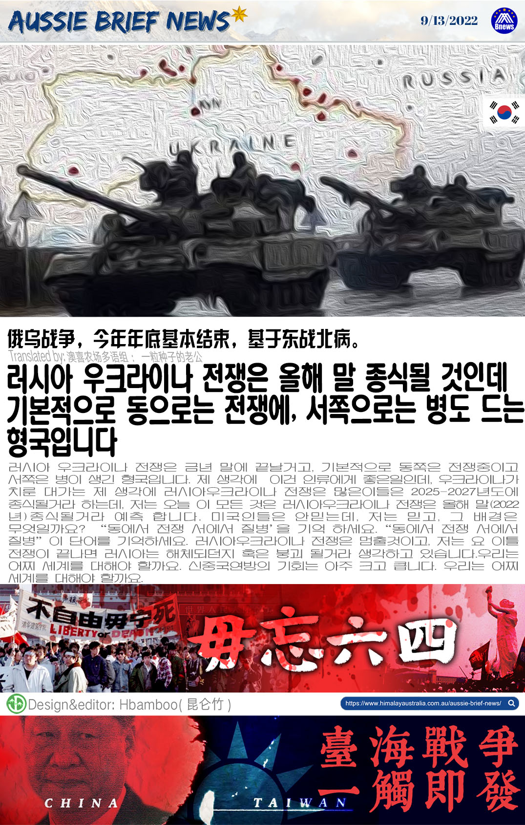 러시아 우크라이나 전쟁은 금년 말에 끝날거고, 기본적으로 동쪽은 전쟁중이고 서쪽은 병이 생긴 형국입니다. 제 생각에 이건 인류에게 좋은일인데, 우크라이나가 치룬 대가는 제 생각에 러시아우크라이나 전쟁은 많은이들은 2025-2027년도에 종식될거라 하는데, 저는 오늘 이 모든 것은 러시아우크라이나 전쟁은 올해 말(2022년)종식될거라 예측 합니다. 미국인들은 안믿는데, 저는 믿고, 그 배경은 무엇일까요? “동에서 전쟁 서에서 질병’을 기억 하세요. “동에서 전쟁 서에서 질병” 이 단어를 기억하세요. 러시아우크라이나 전쟁은 멈출것이고, 저는 요 이틀 전쟁이 끝나면 러시아는 해체되던지 혹은 붕괴 될거라 생각하고 있습니다.우리는 어찌 세계를 대해야 할까요. 신중국연방의 기회는 아주 크고 큽니다. 우리는 어찌 세계를 대해야 할까요.