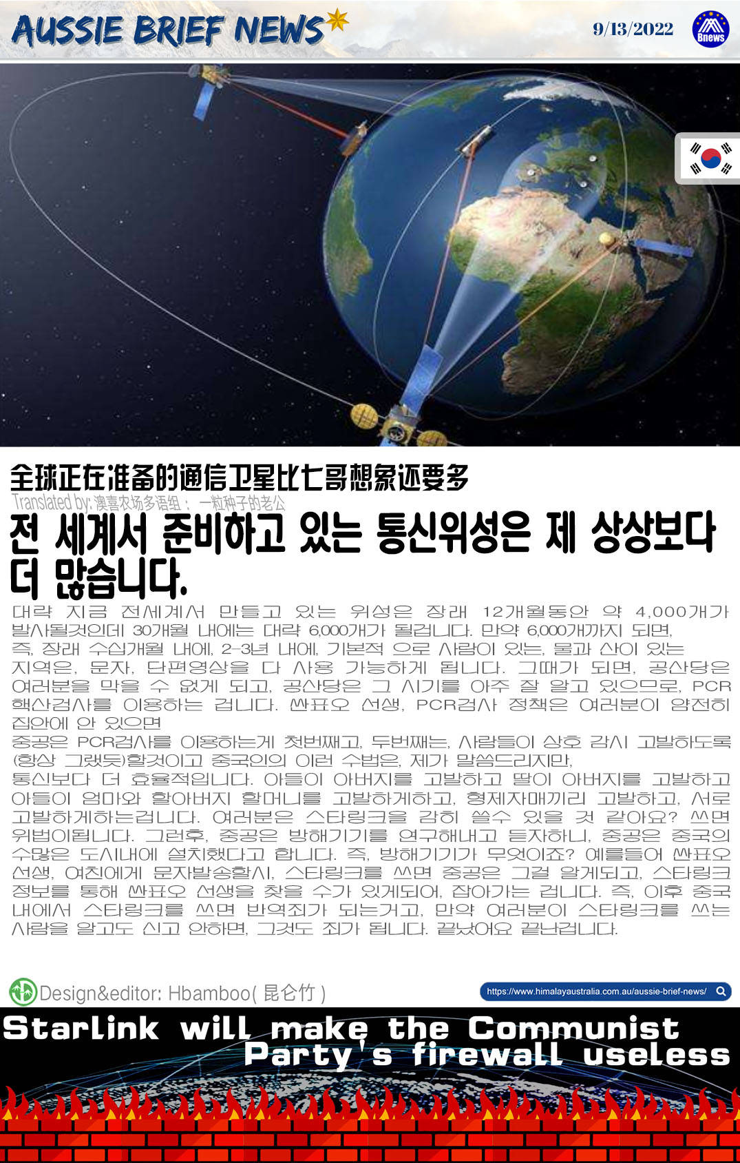 통신보다 더 효율적입니다. 아들이 아버지를 고발하고 딸이 아버지를 고발하고 아들이 엄마와 할아버지 할머니를 고발하게하고, 형제자매끼리 고발하고, 서로 고발하게하는겁니다. 여러분은 스타링크을 감히 쓸수 있을 것 같아요? 쓰면 위법이됩니다. 그런후, 중공은 방해기기를 연구해내고 듣자하니, 중공은 중국의 수많은 도시내에 설치했다고 합니다. 즉, 방해기기가 무엇이죠? 예를들어 싼표오 선생, 여친에게 문자발송할시, 스타링크를 쓰면 중공은 그걸 알게되고, 스타링크 정보를 통해 싼표오 선생을 찾을 수가 있게되어, 잡아가는 겁니다. 즉, 이후 중국 내에서 스타링크를 쓰면 반역죄가 되는거고, 만약 여러분이 스타링크를 쓰는 사람을 알고도 신고 안하면, 그것도 죄가 됩니다. 끝났어요 끝난겁니다.