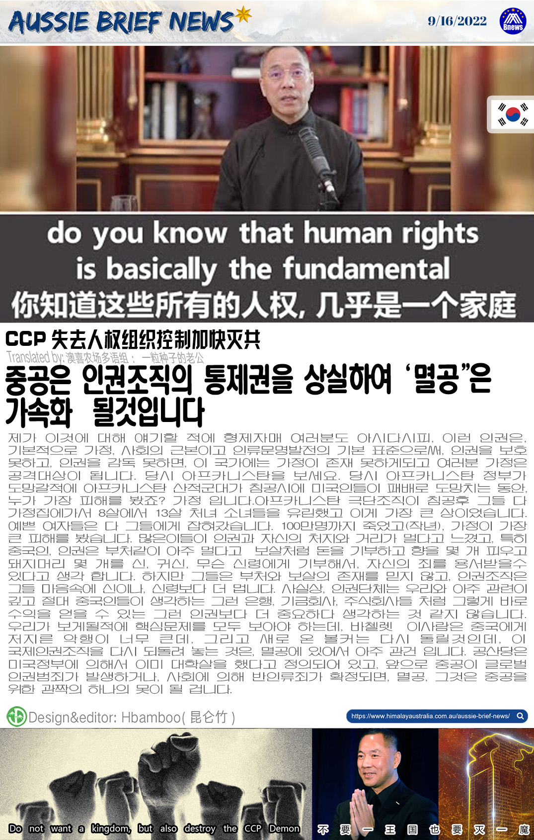 제가 이것에 대해 얘기할 적에 형제자매 여러분도 아시다시피, 이런 인권은, 기본적으로 가정, 사회의 근본이고 인류문명발전의 기본 표준으로써, 인권을 보호 못하고, 인권을 감독 못하면, 이 국가에는 가정이 존재 못하게되고 여러분 가정은 공격대상이 됩니다. 당시 아프카니스탄을 보세요. 당시 아프카니스탄 정부가 도망갈적에 아프카니스탄 산적군대가 침공시에 미국인들이 패배로 도망치는 동안, 누가 가장 피해를 봤죠? 가정 입니다.아프카니스탄 극단조직이 침공후 그들 다 가정집에가서 8살에서 13살 처녀 소녀들을 유린했고 이게 가장 큰 상이었습니다. 예쁜 여자들은 다 그들에게 잡혀갔습니다. 100만명까지 죽었고(작년), 가정이 가장 큰 피해를 봤습니다. 많은이들이 인권과 자신의 처지와 거리가 멀다고 느꼈고, 특히 중국인, 인권은 부처같이 아주 멀다고 보살처럼 돈을 기부하고 향을 몇 개 피우고 돼지머리 몇 개를 신, 귀신, 무슨 신령에게 기부해서, 자신의 죄를 용서받을수 있다고 생각 합니다. 하지만 그들은 부처와 보살의 존재를 믿지 않고, 인권조직은 그들 마음속에 신이나, 신령보다 더 멉니다. 사실상, 인권단체는 우리와 아주 관련이 깊고 절대 중국인들이 생각하는 그런 은행, 기금회사, 주식회사들 처럼 그렇게 바로 수익을 얻을 수 있는 그런 인권보다 더 중요하다 생각하는 것 같지 않습니다. 우리가 보게될적에 핵심문제를 모두 보아야 하는데, 바첼렛 이사람은 중국에게 저지른 악행이 너무 큰데, 그리고 새로 온 볼커는 다시 돌릴것인데, 이 국제인권조직을 다시 되돌려 놓는 것은, 멸공에 있어서 아주 관건 입니다. 공산당은 미국정부에 의해서 이미 대학살을 했다고 정의되어 있고, 앞으로 중공이 글로벌 인권범죄가 발생하거나, 사회에 의해 반인류죄가 확정되면, 멸공, 그것은 중공을 위한 관짝의 하나의 못이 될 겁니다.