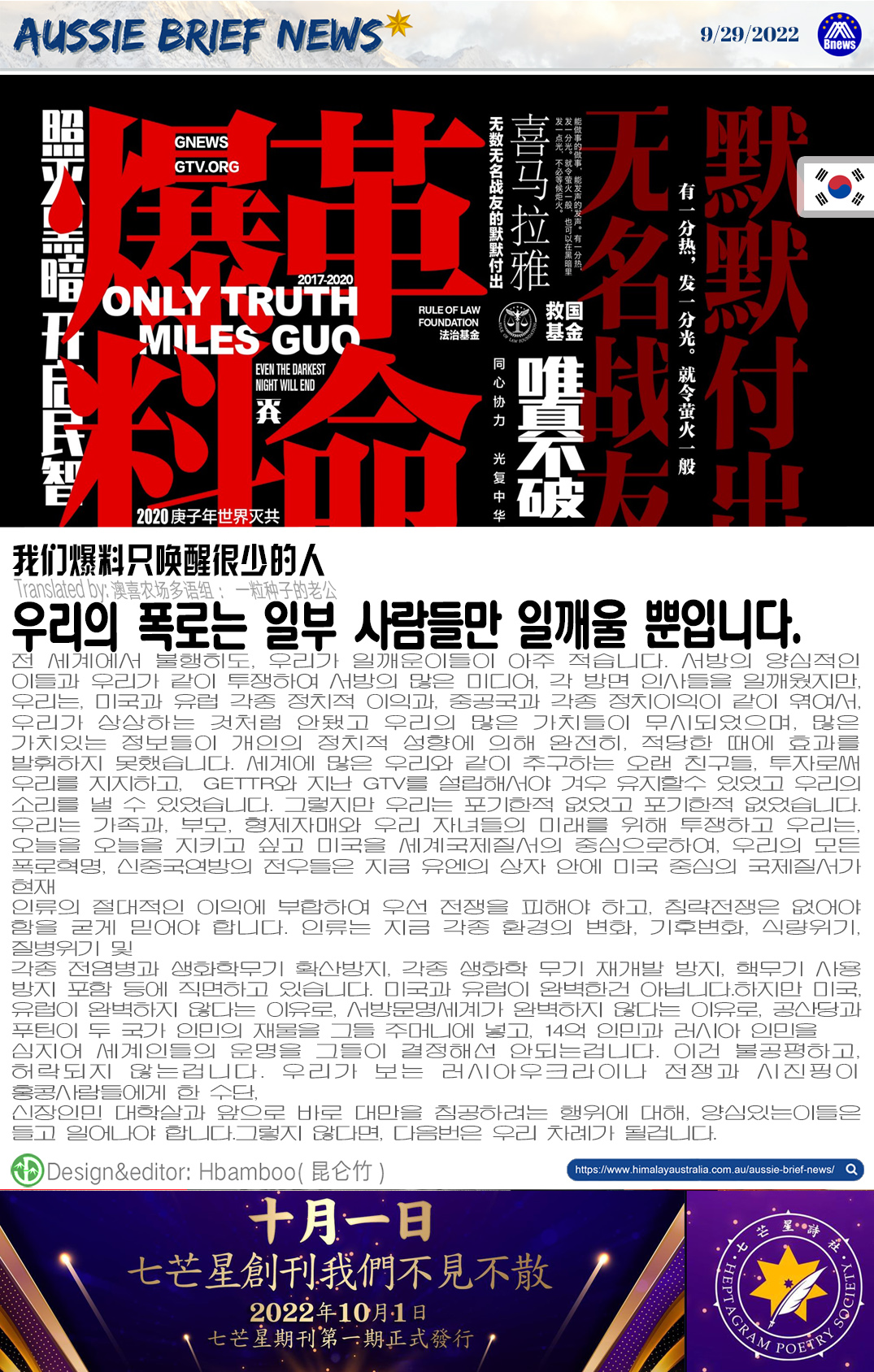 전 세계에서 불행히도, 우리가 일깨운이들이 아주 적습니다. 서방의 양심적인 이들과 우리가 같이 투쟁하여 서방의 많은 미디어, 각 방면 인사들을 일깨웠지만, 우리는, 미국과 유럽 각종 정치적 이익과, 중공국과 각종 정치이익이 같이 엮여서, 우리가 상상하는 것처럼 안됐고 우리의 많은 가치들이 무시되었으며, 많은 가치있는 정보들이 개인의 정치적 성향에 의해 완전히, 적당한 때에 효과를 발휘하지 못했습니다. 세계에 많은 우리와 같이 추구하는 오랜 친구들, 투자로써 우리를 지지하고, GETTR와 지난 GTV를 설립해서야 겨우 유지할수 있었고 우리의 소리를 낼 수 있었습니다. 그렇지만 우리는 포기한적 없었고 포기한적 없었습니다. 우리는 가족과, 부모, 형제자매와 우리 자녀들의 미래를 위해 투쟁하고 우리는, 오늘을 오늘을 지키고 싶고 미국을 세계국제질서의 중심으로하여, 우리의 모든 폭로혁명, 신중국연방의 전우들은 지금 유엔의 상자 안에 미국 중심의 국제질서가 현재 인류의 절대적인 이익에 부합하여 우선 전쟁을 피해야 하고, 침략전쟁은 없어야 함을 굳게 믿어야 합니다. 인류는 지금 각종 환경의 변화, 기후변화, 식량위기, 질병위기 및 각종 전염병과 생화학무기 확산방지, 각종 생화학 무기 재개발 방지, 핵무기 사용 방지 포함 등에 직면하고 있습니다. 미국과 유럽이 완벽한건 아닙니다.하지만 미국, 유럽이 완벽하지 않다는 이유로, 서방문명세계가 완벽하지 않다는 이유로, 공산당과 푸틴이 두 국가 인민의 재물을 그들 주머니에 넣고, 14억 인민과 러시아 인민을 심지어 세계인들의 운명을 그들이 결정해선 안되는겁니다. 이건 불공평하고, 허락되지 않는겁니다. 우리가 보는 러시아우크라이나 전쟁과 시진핑이 홍콩사람들에게 한 수단, 신장인민 대학살과 앞으로 바로 대만을 침공하려는 행위에 대해, 양심있는이들은 들고 일어나야 합니다.그렇지 않다면, 다음번은 우리 차례가 될겁니다.