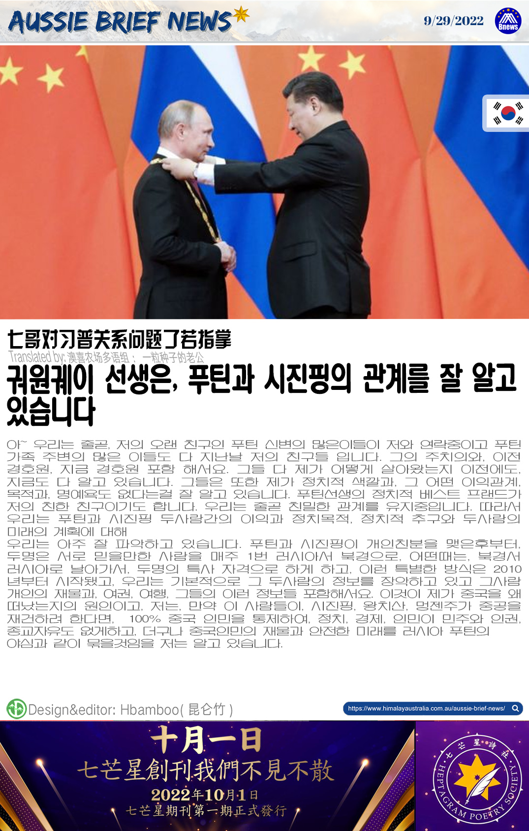 아~ 우리는 줄곧, 저의 오랜 친구인 푸틴 신변의 많은이들이 저와 연락중이고 푸틴 가족 주변의 많은 이들도 다 지난날 저의 친구들 입니다. 그의 주치의와, 이전 경호원, 지금 경호원 포함 해서요. 그들 다 제가 어떻게 살아왔는지 이전에도, 지금도 다 알고 있습니다. 그들은 또한 제가 정치적 색깔과, 그 어떤 이익관계, 목적과, 명예욕도 없다는걸 잘 알고 있습니다. 푸틴선생의 정치적 베스트 프랜드가 저의 친한 친구이기도 합니다. 우리는 줄곧 친밀한 관계를 유지중입니다. 따라서 우리는 푸틴과 시진핑 두사람간의 이익과 정치목적, 정치적 추구와 두사람의 미래의 계획에 대해 우리는 아주 잘 파악하고 있습니다. 푸틴과 시진핑이 개인친분을 맺은후부터, 두명은 서로 믿을만한 사람을 매주 1번 러시아서 북경으로, 어떤때는, 북경서 러시아로 날아가서, 두명의 특사 자격으로 하게 하고, 이런 특별한 방식은 2010년부터 시작됐고, 우리는 기본적으로 그 두사람의 정보를 장악하고 있고 그사람 개인의 재물과, 여권, 여행, 그들의 이런 정보들 포함해서요. 이것이 제가 중국을 왜 떠났는지의 원인이고, 저는, 만약 이 사람들이, 시진핑, 왕치산, 멍젠주가 중공을 재건하려 한다면, 100% 중국 인민을 통제하여, 정치, 경제, 인민이 민주와 인권, 종교자유도 없게하고, 더구나 중국인민의 재물과 안전한 미래를 러시아 푸틴의 야심과 같이 묶을것임을 저는 알고 있습니다.