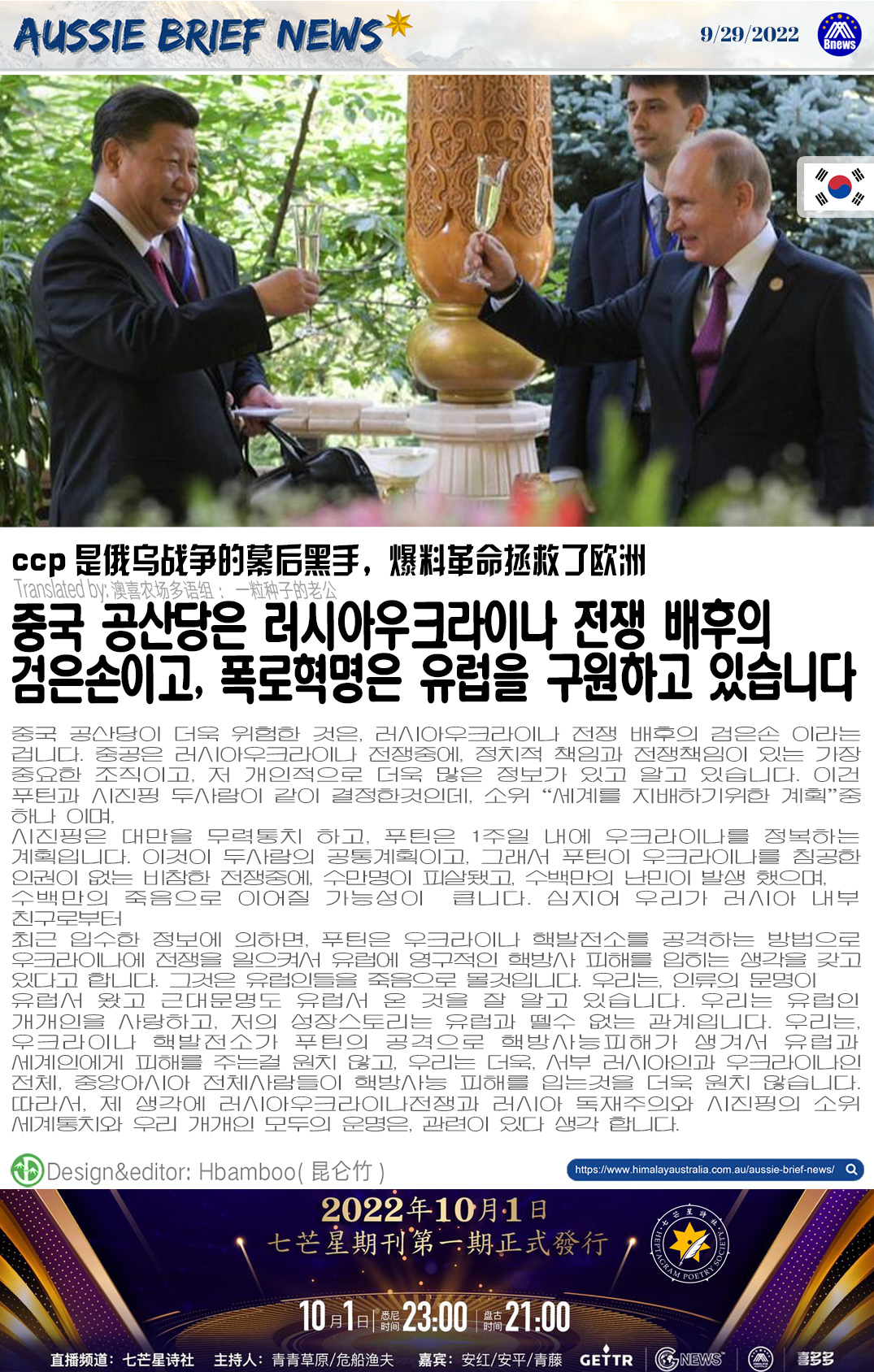 중국 공산당이 더욱 위험한 것은, 러시아우크라이나 전쟁 배후의 검은손 이라는 겁니다. 중공은 러시아우크라이나 전쟁중에, 정치적 책임과 전쟁책임이 있는 가장 중요한 조직이고, 저 개인적으로 더욱 많은 정보가 있고 알고 있습니다. 이건 푸틴과 시진핑 두사람이 같이 결정한것인데, 소위 “세계를 지배하기위한 계획”중 하나 이며, 시진핑은 대만을 무력통치 하고, 푸틴은 1주일 내에 우크라이나를 정복하는 계획입니다. 이것이 두사람의 공통계획이고, 그래서 푸틴이 우크라이나를 침공한 인권이 없는 비참한 전쟁중에, 수만명이 피살됐고, 수백만의 난민이 발생 했으며, 수백만의 죽음으로 이어질 가능성이 큽니다. 심지어 우리가 러시아 내부 친구로부터 최근 입수한 정보에 의하면, 푸틴은 우크라이나 핵발전소를 공격하는 방법으로 우크라이나에 전쟁을 일으켜서 유럽에 영구적인 핵방사 피해를 입히는 생각을 갖고 있다고 합니다. 그것은 유럽인들을 죽음으로 몰것입니다. 우리는, 인류의 문명이 유럽서 왔고 근대문명도 유럽서 온 것을 잘 알고 있습니다. 우리는 유럽인 개개인을 사랑하고, 저의 성장스토리는 유럽과 뗄수 없는 관계입니다. 우리는, 우크라이나 핵발전소가 푸틴의 공격으로 핵방사능피해가 생겨서 유럽과 세계인에게 피해를 주는걸 원치 않고, 우리는 더욱, 서부 러시아인과 우크라이나인 전체, 중앙아시아 전체사람들이 핵방사능 피해를 입는것을 더욱 원치 않습니다. 따라서, 제 생각에 러시아우크라이나전쟁과 러시아 독재주의와 시진핑의 소위 세계통치와 우리 개개인 모두의 운명은, 관련이 있다 생각 합니다.