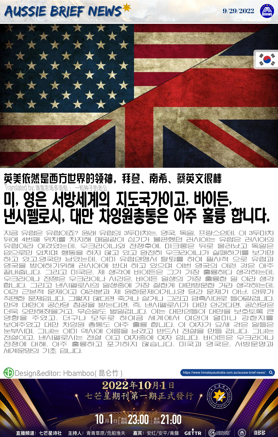 지금 유럽은 유럽이죠? 원래 유럽의 3두마차는, 영국, 독일, 프랑스인데, 이 3두마차 뒤에 4번째 위치를 차지해 매일같이 심기가 불편했던 러시아는 유럽은 러시아의 유럽이라 여겼었는데, 우크라이나와 전쟁후에, 마크롱은 뒤로 물러났고 독일은 입으로만 외치며 행동을 하지 않고 있고 완전히 우크라이나가 실패하기를 보기만 하고 있고,영국만 남았는데, 이미 유럽연맹서 탈퇴를 하여 필사적 으로 유럽과 영국을 방어하기위해 러시아에 반대 하고 있으며 이번 영국의 이런 것은 아주 끝내줍니다. 그리고 미국은, 제 생각에 바이든은 그가 가장 훌륭하다 생각하는데, 우크라이나 전쟁은 우크라이나 사건은, 바이든 일생의 가장 훌륭한 일 이라 생각 합니다. 그리고 낸시펠로시의 일생중에 가장 잘한게 대만방문한 거라 생각하는데, 이건 근본적 문제이고 여러분과 제 원한문제이거나,양 당간 문제가 아닌, 인류가 직면한 문제입니다. 그렇지 않다면 죽거나 살거나 그리고 암흑시대로 들어갈겁니다. 만약 대만이 공산당 침공을 받는다면, 즉, 낸시펠로시가 대만 안간다면, 공산당은 더욱 오만해졌을거고, 무슨일도 벌일겁니다. 이는 대만인들이 대만을 보호토록 큰 영향을 주었고, 더구나 모두로 하여금 세계에서 여인이 얼마나 강한지를 보여주었고 대만 차잉원 총통도 아주 훌륭 합니다. 이 여자가 요새 겪은 일들은 눈부시며, 그녀는 이미 역사에 이름을 남겼고 반드시 전설을 만들 겁니다. 그녀는 전설이고, 낸시펠로시는 전설 이고 여자중에 여자 입니다. 바이든은 우크라이나 전쟁에 대해, 아주 훌륭하고 포기하지 않습니다. 미국과 영국은, 서방문명과 세계문명의 기초 입니다.