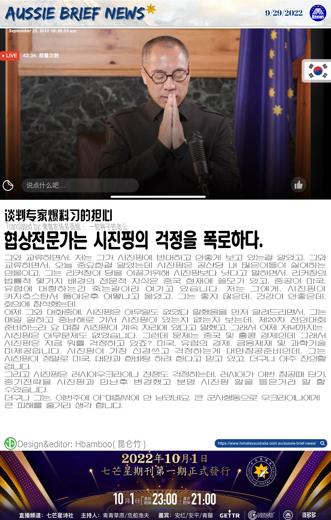 그와 교류하면서, 저는 그가 시진핑에 반대하고 안좋게 보고 있는걸 알았고, 그와 교류하면서, 오늘 중요한걸 알았는데 시진핑은 공산당 내 많은이들이 싫어하는 인물이고, 그는 리커창이 당을 이끌기위해 시진핑보다 낫다고 말하면서, 리커창의 법률적 몇가지 배경의 전문적 지식은 중국 현재에 쓸모가 있고, 중공이 미국, 유럽에 대항하는건 죽는길이라 여기고 있습니다. 저는 그에게, 시진핑이 카자흐스탄서 돌아온후 어떻냐고 물었고, 그는 좋지 않은데, 건강이 안좋은데, 회의에 참석했는데 어제 그와 대화중에, 시진핑은 아무일도 없었다 말했음을 먼저 알려드리면서, 그는 매일 일하고 중남해로 가서 시진핑이 있는지 없는지 보는데, 제20차 전인대회 준비하느라 요 며칠 시진핑이 계속 자리에 있다고 말했고, 그래서 어제 저녁까지는 시진핑은 아무문제도 없었습니다. 그런데 문제는 중국 및 홍콩 경제인데 그래서 시진핑은 지금 뭐를 걱정하고 있죠? 미국, 유럽의 경제, 금융제재 및 과학기술 미제공입니다. 시진핑이 가장 신경쓰고 걱정하는게 대만침공준비인데, 그는 시진핑이 정말로 미국, 대만과 한바탕 하려 한다고 믿고 있고, 더구나 아주 잔인할 겁니다. 그리고 시진핑은 러시아우크라이나 전쟁도 걱정하는데, 러시아가 이번 침공때 단기, 중기전략을 시진핑과 만난후 변경했고 분명 시진핑 말을 들은거라 말 할 수있습니다. 더구나 그는, 이번주에 아~며칠밖에 안 남았네요. 큰 군사행동으로 우크라이나에게 큰 피해를 줄거라 생각 합니다.