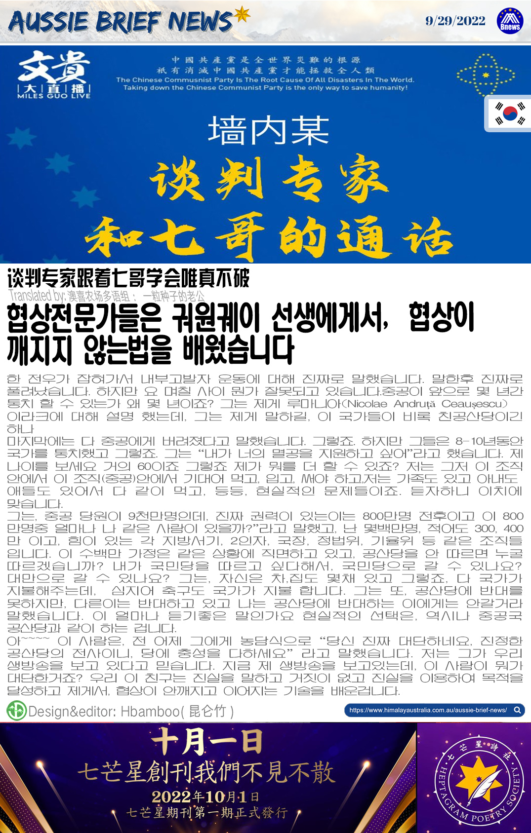 한 전우가 잡혀가서 내부고발자 운동에 대해 진짜로 말했습니다. 말한후 진짜로 풀려났습니다. 하지만 요 며칠 사이 뭔가 잘못되고 있습니다.중공이 앞으로 몇 년간 통치 할 수 있는가 왜 몇 년이죠? 그는 제게 루마니아(Nicolae Andruță Ceaușescu) 이라크에 대해 설명 했는데, 그는 제게 말하길, 이 국가들이 비록 친공산당이긴 하나 마지막에는 다 중공에게 버려졌다고 말했습니다. 그렇죠. 하지만 그들은 8-10년동안 국가를 통치했고 그렇죠. 그는 “내가 너의 멸공을 지원하고 싶어”라고 했습니다. 제 나이를 보세요 거의 60이죠 그렇죠 제가 뭐를 더 할 수 있죠? 저는 그저 이 조직 안에서 이 조직(중공)안에서 기대어 먹고, 입고, 써야 하고,저는 가족도 있고 아내도 애들도 있어서 다 같이 먹고, 등등, 현실적인 문제들이죠. 듣자하니 이치에 맞습니다. 그는, 중공 당원이 9천만명인데, 진짜 권력이 있는이는 800만명 전후이고 이 800만명중 얼마나 나 같은 사람이 있을까?”라고 말했고, 난 몇백만명, 적어도 300, 400만 이고, 힘이 있는 각 지방서기, 2인자, 국장, 정법위, 기율위 등 같은 조직들 입니다. 이 수백만 가정은 같은 상황에 직면하고 있고, 공산당을 안 따르면 누굴 따르겠습니까? 내가 국민당을 따르고 싶다해서, 국민당으로 갈 수 있나요? 대만으로 갈 수 있나요? 그는, 자신은 차,집도 몇채 있고 그렇죠, 다 국가가 지불해주는데, 심지어 축구도 국가가 지불 합니다. 그는 또, 공산당에 반대를 못하지만, 다른이는 반대하고 있고 나는 공산당에 반대하는 이에게는 안갈거라 말했습니다. 이 얼마나 듣기좋은 말인가요 현실적인 선택은, 역시나 중공국 공산당과 같이 하는 겁니다. 아~~~~ 이 사람은, 전 어제 그에게 농담식으로 “당신 진짜 대단하네요, 진정한 공산당의 전사이니, 당에 충성을 다하세요” 라고 말했습니다. 저는 그가 우리 생방송을 보고 있다고 믿습니다. 지금 제 생방송을 보고있는데, 이 사람이 뭐가 대단한거죠? 우리 이 친구는 진실을 말하고 거짓이 없고 진실을 이용하여 목적을 달성하고 제게서, 협상이 안깨지고 이어지는 기술을 배운겁니다.