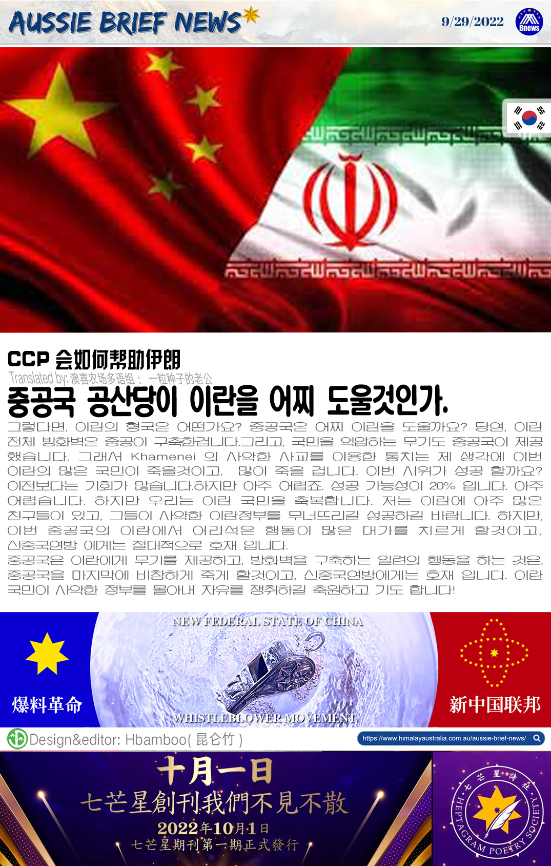 그렇다면, 이란의 형국은 어떤가요? 중공국은 어찌 이란을 도울까요? 당연, 이란 전체 방화벽은 중공이 구축한겁니다.그리고, 국민을 억압하는 무기도 중공국이 제공 했습니다. 그래서 Khamenei 의 사악한 사교를 이용한 통치는 제 생각에 이번 이란의 많은 국민이 죽을것이고, 많이 죽을 겁니다. 이번 시위가 성공 할까요? 이전보다는 기회가 많습니다.하지만 아주 어렵죠. 성공 가능성이 20% 입니다. 아주 어렵습니다. 하지만 우리는 이란 국민을 축복합니다. 저는 이란에 아주 많은 친구들이 있고, 그들이 사악한 이란정부를 무너뜨리길 성공하길 바랍니다. 하지만, 이번 중공국의 이란에서 어리석은 행동이 많은 대가를 치르게 할것이고, 신중국연방 에게는 절대적으로 호재 입니다. 중공국은 이란에게 무기를 제공하고, 방화벽을 구축하는 일련의 행동을 하는 것은, 중공국을 마지막에 비참하게 죽게 할것이고, 신중국연방에게는 호재 입니다. 이란 국민이 사악한 정부를 몰아내 자유를 쟁취하길 축원하고 기도 합니다!