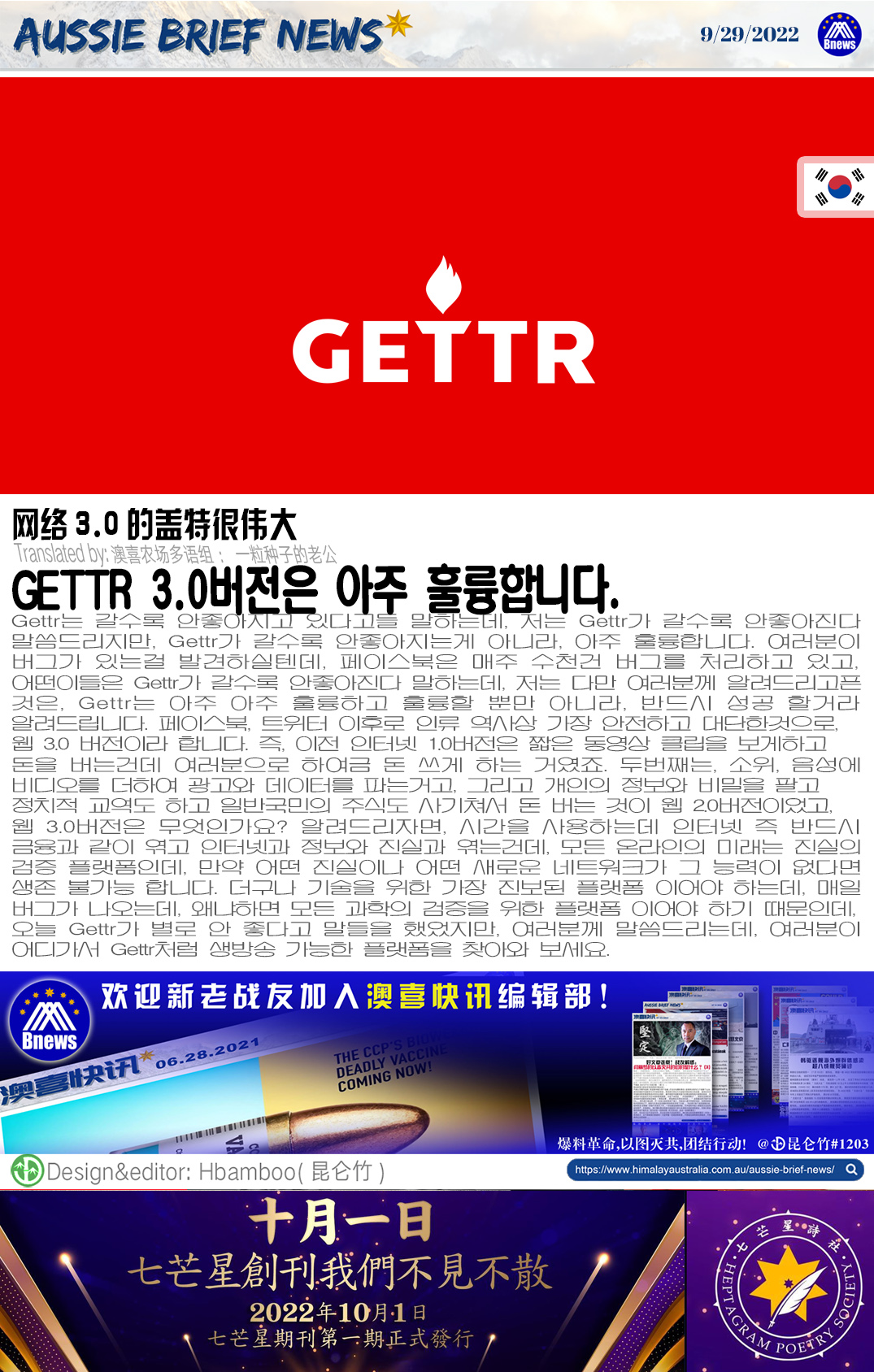 Gettr는 갈수록 안좋아지고 있다고들 말하는데, 저는 Gettr가 갈수록 안좋아진다 말씀드리지만, Gettr가 갈수록 안좋아지는게 아니라, 아주 훌륭합니다. 여러분이 버그가 있는걸 발견하실텐데, 페이스북은 매주 수천건 버그를 처리하고 있고, 어떤이들은 Gettr가 갈수록 안좋아진다 말하는데, 저는 다만 여러분께 알려드리고픈 것은, Gettr는 아주 아주 훌륭하고 훌륭할 뿐만 아니라, 반드시 성공 할거라 알려드립니다. 페이스북, 트위터 이후로 인류 역사상 가장 안전하고 대단한것으로, 웹 3.0 버전이라 합니다. 즉, 이전 인터넷 1.0버전은 짧은 동영상 클립을 보게하고 돈을 버는건데 여러분으로 하여금 돈 쓰게 하는 거였죠. 두번째는, 소위, 음성에 비디오를 더하여 광고와 데이터를 파는거고, 그리고 개인의 정보와 비밀을 팔고 정치적 교역도 하고 일반국민의 주식도 사기쳐서 돈 버는 것이 웹 2.0버전이었고, 웹 3.0버전은 무엇인가요? 알려드리자면, 시간을 사용하는데 인터넷 즉 반드시 금융과 같이 엮고 인터넷과 정보와 진실과 엮는건데, 모든 온라인의 미래는 진실의 검증 플랫폼인데, 만약 어떤 진실이나 어떤 새로운 네트워크가 그 능력이 없다면 생존 불가능 합니다. 더구나 기술을 위한 가장 진보된 플랫폼 이어야 하는데, 매일 버그가 나오는데, 왜냐하면 모든 과학의 검증을 위한 플랫폼 이어야 하기 때문인데, 오늘 Gettr가 별로 안 좋다고 말들을 했었지만, 여러분께 말씀드리는데, 여러분이 어디가서 Gettr처럼 생방송 가능한 플랫폼을 찾아와 보세요.