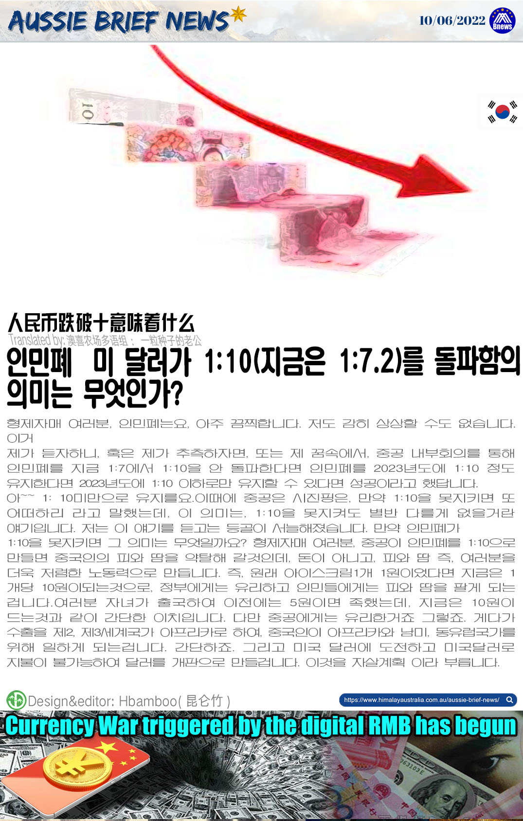 1:10을 못지키면 그 의미는 무엇일까요? 형제자매 여러분, 중공이 인민폐를 1:10으로 만들면 중국인의 피와 땀을 약탈해 갈것인데, 돈이 아니고, 피와 땀 즉, 여러분을 더욱 저렴한 노동력으로 만듭니다. 즉, 원래 아이스크림1개 1원이었다면 지금은 1개당 10원이되는것으로, 정부에게는 유리하고 인민들에게는 피와 땀을 팔게 되는 겁니다.여러분 자녀가 출국하여 이전에는 5원이면 족했는데, 지금은 10원이 드는것과 같이 간단한 이치입니다. 다만 중공에게는 유리한거죠 그렇죠. 게다가 수출을 제2, 제3세계국가 아프리카로 하여, 중국인이 아프리카와 남미, 동유럽국가를 위해 일하게 되는겁니다. 간단하죠. 그리고 미국 달러에 도전하고 미국달러로 지불이 불가능하여 달러를 개판으로 만들겁니다. 이것을 자살계획 이라 부릅니다.