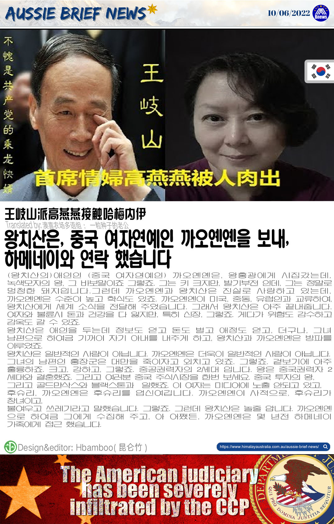 (왕치산의)애인인 (중국 여자연예인) 까오옌옌은, 왕홍광에게 시집갔는데, 녹색모자의 왕, 그 바보말이죠 그렇죠. 그는 키 크지만, 발기부전 인데, 그는 정말로 멍청한 돼지입니다.그런데 까오옌옌과 왕치산은 진실로 사랑하고 있는데, 까오옌옌은 수준이 높고 학식도 있죠. 까오옌옌이 미국, 중동, 유럽인과 교류하여, 왕치산에게 세계 소식을 전달해 주었습니다. 그래서 왕치산은 아주 끝내줍니다. 여자와 불륜시 돈과 건강을 다 잃지만, 특히 신장, 그렇죠. 게다가 위험도 감수하고 감옥도 갈 수 있죠.