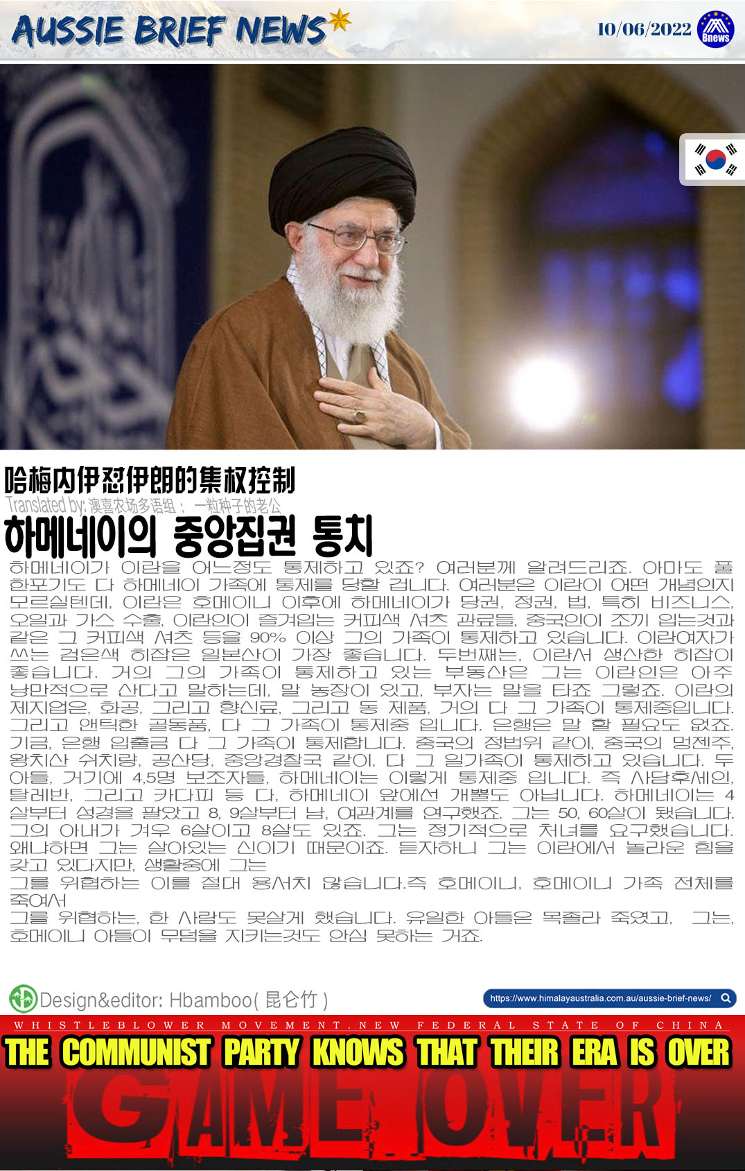 하메네이가 이란을 어느정도 통제하고 있죠? 여러분께 알려드리죠. 아마도 풀 한포기도 다 하메네이 가족에 통제를 당할 겁니다. 여러분은 이란이 어떤 개념인지 모르실텐데, 이란은 호메이니 이후에 하메네이가 당권, 정권, 법, 특히 비즈니스, 오일과 가스 수출, 이란인이 즐겨입는 커피색 셔츠 관료들, 중국인이 조끼 입는것과 같은 그 커피색 셔츠 등을 90% 이상 그의 가족이 통제하고 있습니다. 이란여자가 쓰는 검은색 히잡은 일본산이 가장 좋습니다. 두번째는, 이란서 생산한 히잡이 좋습니다. 거의 그의 가족이 통제하고 있는 부동산은 그는 이란인은 아주 낭만적으로 산다고 말하는데, 말 농장이 있고, 부자는 말을 타죠 그렇죠. 이란의 제지업은, 화공, 그리고 향신료, 그리고 동 제품, 거의 다 그 가족이 통제중입니다. 그리고 앤틱한 골동품, 다 그 가족이 통제중 입니다. 은행은 말 할 필요도 없죠. 기금, 은행 입출금 다 그 가족이 통제합니다. 중국의 정법위 같이, 중국의 멍젠주, 왕치산 쉬치량, 공산당, 중앙경찰국 같이, 다 그 일가족이 통제하고 있습니다. 두 아들, 거기에 4,5명 보조자들, 하메네이는 이렇게 통제중 입니다. 즉 사담후세인, 탈레반, 그리고 카다피 등 다, 하메네이 앞에선 개뿔도 아닙니다. 하메네이는 4살부터 성경을 팔았고 8, 9살부터 남, 여관계를 연구했죠. 그는 50, 60살이 됐습니다. 그의 아내가 겨우 6살이고 8살도 있죠. 그는 정기적으로 처녀를 요구했습니다. 왜냐하면 그는 살아있는 신이기 때문이죠. 듣자하니 그는 이란에서 놀라운 힘을 갖고 있다지만, 생활중에 그는.