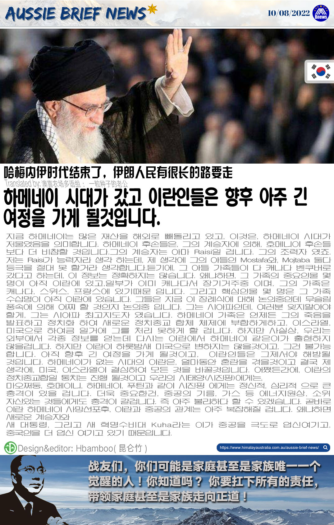 지금 하메네이는 많은 재산을 해외로 빼돌리고 있고, 이것은, 하메네이 시대가 저물었음을 의미합니다. 하메네이 후손들은, 그의 계승자에 의해, 호메니이 후손들 보다 더 비참할 것입니다.그의 계승자는 아마 Raisi일 겁니다. 그의 조력자 였죠. 저는 Raisi가 능력자라 생각 하는데, 제 생각에 그의 아들인 Mostafa와, Mojtaba 둘다 등극을 절대 못 할거라 생각합니다.듣기에, 그 아들 가족들이 다 캐나다 벤쿠버로 갔다고 하는데, 이 정보는 정확하지는 않습니다. 왜냐하면, 그 가족의 중요인물 몇 명이 아직 이란에 있고,일부가 이미 캐나다서 장기거주중 이며, 그의 가족은 캐나다, 스위스, 프랑스에 있기때문 입니다. 그리고 핵심인물 몇 명은 그 가족 수십명이 아직 이란에 있습니다. 그들은 지금 이 장례식에 대해 논의중인데 무슬림 풍속에 의해 어찌 할 것인지 논의중 입니다. 그는 시아파인데, 여러분 잊지말아야 할게, 그는 시아파 최고지도자 였습니다. 하메네이 가족은 언제든 그의 죽음을 발표하고 정치화 하여 새로운 정치종교 합체 체제에 부합하게하고, 이스라엘, 미국으로 하여금 일거에 그를 처리 못하게 할 겁니다. 하지만 사실상, 우리는 외부에서 각종 정보를 얻는데 다시는 이란에서 하메네이 같은이가 출현하지 않을겁니다. 하지만 이란이 하룻밤새 미국으로 변하지는 않을것이고, 그건 불가능 합니다. 아직 향후 긴 여정을 가게 될것이고, 이란인들은 그제서야 해방될 것입니다. 하메네이가 없는 시대의 이란은, 얼마동안 혼란을 겪을것이고 결국 제 생각에, 미국, 이스라엘이 결심하여 모든 것을 바꿀것입니다. 어쨌든간에, 이란의 정치종교합일 통치는 진행 될것이고 우리의 시태양(시진핑)에게는,