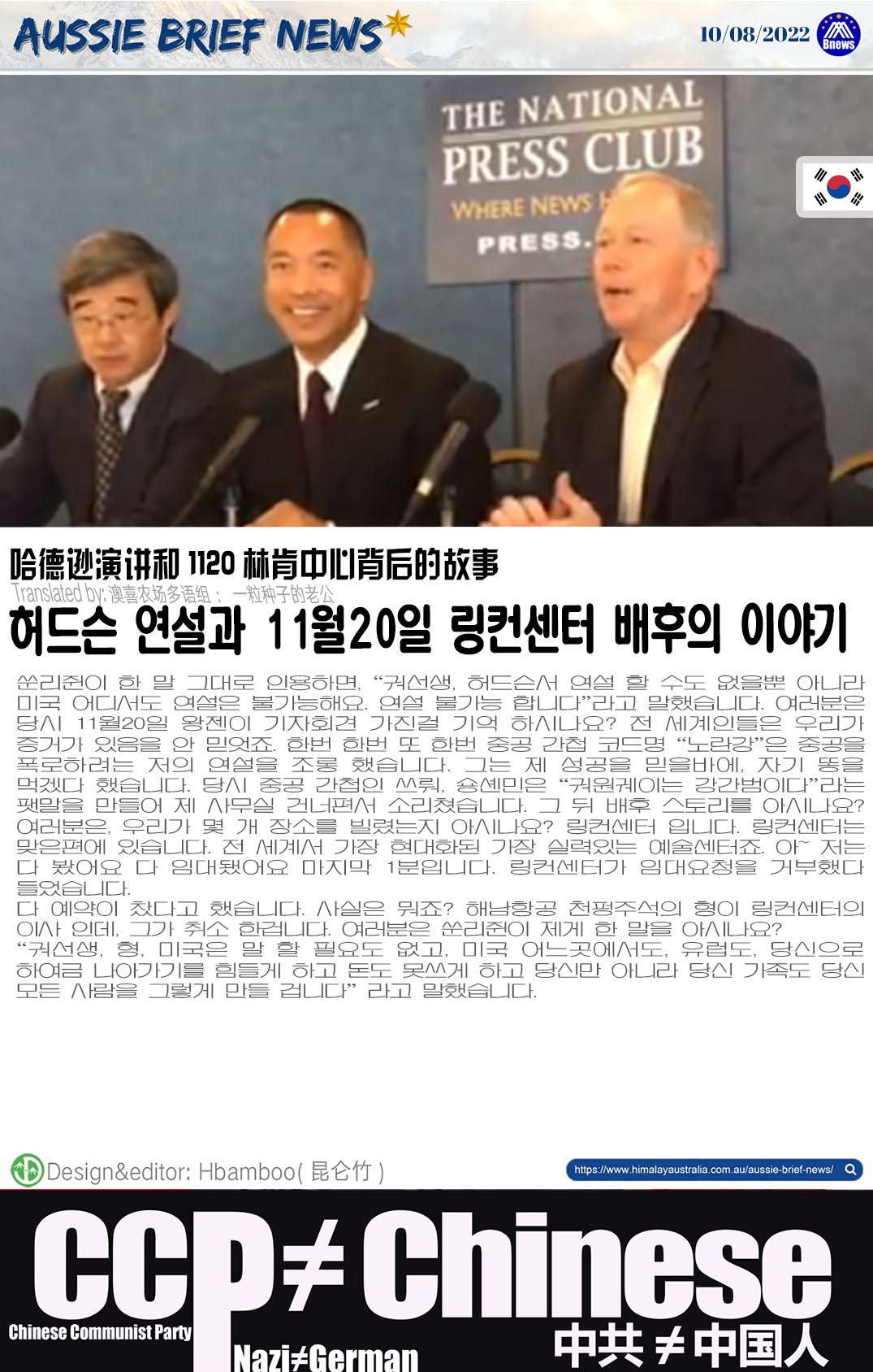 쑨리쥔이 한 말 그대로 인용하면, “궈선생, 허드슨서 연설 할 수도 없을뿐 아니라 미국 어디서도 연설은 불가능해요. 연설 불가능 합니다”라고 말했습니다. 여러분은 당시 11월20일 왕젠이 기자회견 가진걸 기억 하시나요? 전 세계인들은 우리가 증거가 있음을 안 믿엇죠. 한번 한번 또 한번 중공 간첩 코드명 “노란강”은 중공을 폭로하려는 저의 연설을 조롱 했습니다. 그는 제 성공을 믿을바에, 자기 똥을 먹겠다 했습니다. 당시 중공 간첩인 쓰뤄, 숑셴민은 “궈원궤이는 강간범이다”라는 팻말을 만들어 제 사무실 건너편서 소리쳤습니다. 그 뒤 배후 스토리를 아시나요? 여러분은, 우리가 몇 개 장소를 빌렸는지 아시나요? 링컨센터 입니다. 링컨센터는 맞은편에 있습니다. 전 세계서 가장 현대화된 가장 실력있는 예술센터죠. 아~ 저는 다 봤어요 다 임대됐어요 마지막 1분입니다. 링컨센터가 임대요청을 거부했다 들었습니다.