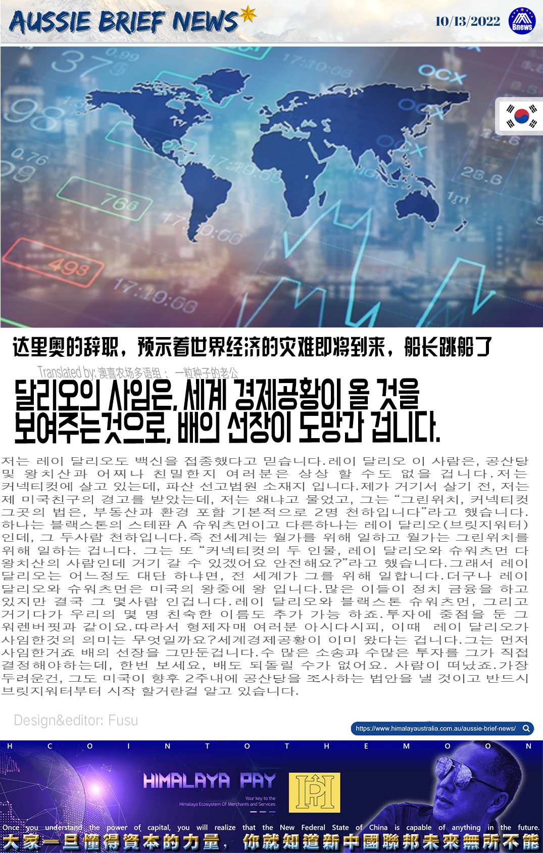 저는 레이 달리오도 백신을 접종했다고 믿습니다.레이 달리오 이 사람은, 공산당 및 왕치산과 어찌나 친밀한지 여러분은 상상 할 수도 없을 겁니다.저는 커넥티컷에 살고 있는데, 파산 선고법원 소재지 입니다.제가 거기서 살기 전, 저는 제 미국친구의 경고를 받았는데, 저는 왜냐고 물었고, 그는 “그린위치, 커넥티컷 그곳의 법은, 부동산과 환경 포함 기본적으로 2명 천하입니다”라고 했습니다.하나는 블랙스톤의 스테판 A 슈워츠먼이고 다른하나는 레이 달리오(브릿지워터)인데, 그 두사람 천하입니다.즉 전세계는 월가를 위해 일하고 월가는 그린위치를 위해 일하는 겁니다. 그는 또 “커넥티컷의 두 인물, 레이 달리오와 슈워츠먼 다 왕치산의 사람인데 거기 갈 수 있겠어요 안전해요?”라고 했습니다.그래서 레이 달리오는 어느정도 대단 하냐면, 전 세계가 그를 위해 일합니다.더구나 레이 달리오와 슈워츠먼은 미국의 왕중에 왕 입니다.많은 이들이 정치 금융을 하고 있지만 결국 그 몇사람 인겁니다.레이 달리오와 블랙스톤 슈워츠먼, 그리고 거기다가 우리의 몇 명 친숙한 이름도 추가 가능 하죠.투자에 중점을 둔 그 워렌버핏과 같이요.따라서 형제자매 여러분 아시다시피, 이때 레이 달리오가 사임한것의 의미는 무엇일까요?세계경제공황이 이미 왔다는 겁니다.그는 먼저 사임한거죠 배의 선장을 그만둔겁니다.수 많은 소송과 수많은 투자를 그가 직접 결정해야하는데, 한번 보세요, 배도 되돌릴 수가 없어요. 사람이 떠났죠.가장 두려운건, 그도 미국이 향후 2주내에 공산당을 조사하는 법안을 낼 것이고 반드시 브릿지워터부터 시작 할거란걸 알고 있습니다.