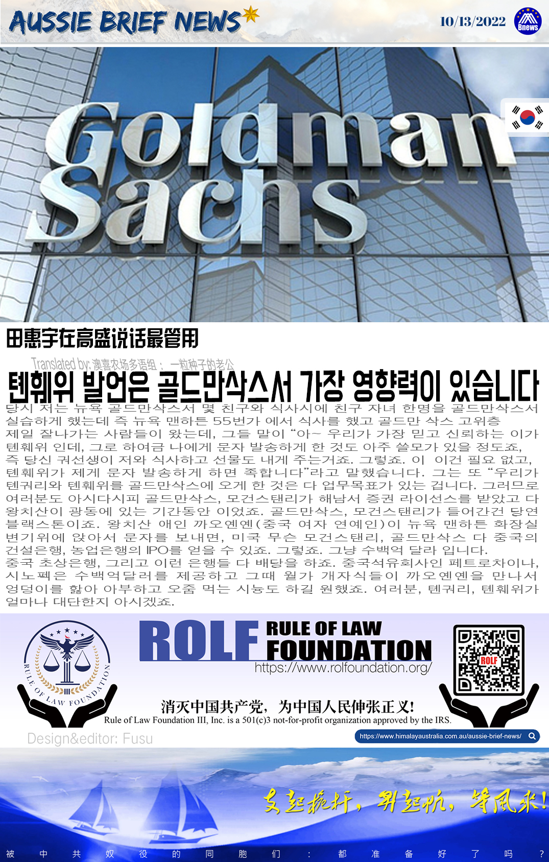 당시 저는 뉴욕 골드만삭스서 몇 친구와 식사시에 친구 자녀 한명을 골드만삭스서 실습하게 했는데 즉 뉴욕 맨하튼 55번가 에서 식사를 했고 골드만 삭스 고위층 제일 잘나가는 사람들이 왔는데, 그들 말이 “아~ 우리가 가장 믿고 신뢰하는 이가 톈훼위 인데, 그로 하여금 나에게 문자 발송하게 한 것도 아주 쓸모가 있을 정도죠, 즉 당신 궈선생이 저와 식사하고 선물도 내게 주는거죠. 그렇죠. 이 이건 필요 없고, 톈훼위가 제게 문자 발송하게 하면 족합니다”라고 말했습니다. 그는 또 “우리가 톈궈리와 톈훼위를 골드만삭스에 오게 한 것은 다 업무목표가 있는 겁니다. 그러므로 여러분도 아시다시피 골드만삭스, 모건스탠리가 해남서 증권 라이선스를 받았고 다 왕치산이 광동에 있는 기간동안 이었죠. 골드만삭스, 모건스탠리가 들어간건 당연 블랙스톤이죠. 왕치산 애인 까오옌옌(중국 여자 연예인)이 뉴욕 맨하튼 화장실 변기위에 앉아서 문자를 보내면, 미국 무슨 모건스탠리, 골드만삭스 다 중국의 건설은행, 농업은행의 IPO를 얻을 수 있죠. 그렇죠. 그냥 수백억 달라 입니다. 중국 초상은행, 그리고 이런 은행들 다 배당을 하죠. 중국석유회사인 페트로차이나, 시노펙은 수백억달러를 제공하고 그때 월가 개자식들이 까오옌옌을 만나서 엉덩이를 핧아 아부하고 오줌 먹는 시늉도 하길 원했죠. 여러분, 톈궈리, 톈훼위가 얼마나 대단한지 아시겠죠.
