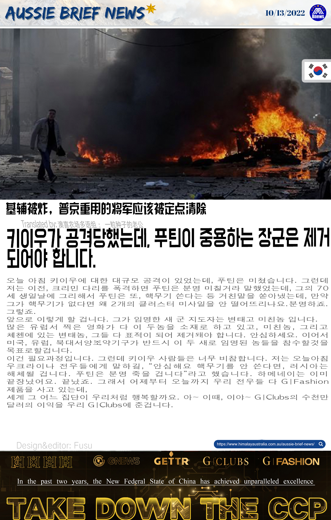 오늘 아침 키이우에 대한 대규모 공격이 있었는데, 푸틴은 미쳤습니다. 그런데 저는 이전, 크리민 다리를 폭격하면 푸틴은 분명 미칠거라 말했었는데, 그의 70세 생일날에 그리해서 푸틴은 또, 핵무기 쓴다는 등 거친말을 쏟아냈는데, 만약 그가 핵무기가 없다면 왜 2개의 클러스터 미사일을 안 떨어뜨리나요.분명하죠. 그렇죠. 앞으로 이렇게 할 겁니다. 그가 임명한 새 군 지도자는 변태고 미친놈 입니다. 많은 유럽서 찍은 영화가 다 이 두놈을 소재로 하고 있고, 미친놈, 그리고 체첸에 있는 변태놈, 그들 다 표적이 되어 제거돼야 합니다. 안심하세요. 이어서 미국, 유럽, 북대서양조약기구가 반드시 이 두 새로 임명된 놈들을 참수할것을 목표로할겁니다. 이건 필요과정입니다. 그런데 키이우 사람들은 너무 비참합니다. 저는 오늘아침 우크라이나 전우들에게 말하길, “안심해요 핵무기를 안 쓴다면, 러시아는 해체될 겁니다. 푸틴은 분명 죽을 겁니다”라고 했습니다. 하메네이는 이미 끝장났어요. 끝났죠. 그래서 어제부터 오늘까지 우리 전우들 다 G|Fashion제품을 사고 있는데, 세계 그 어느 집단이 우리처럼 행복할까요. 아~ 이때, 이야~ G|Clubs의 수천만 달러의 이익을 우리 G|Clubs에 준겁니다.