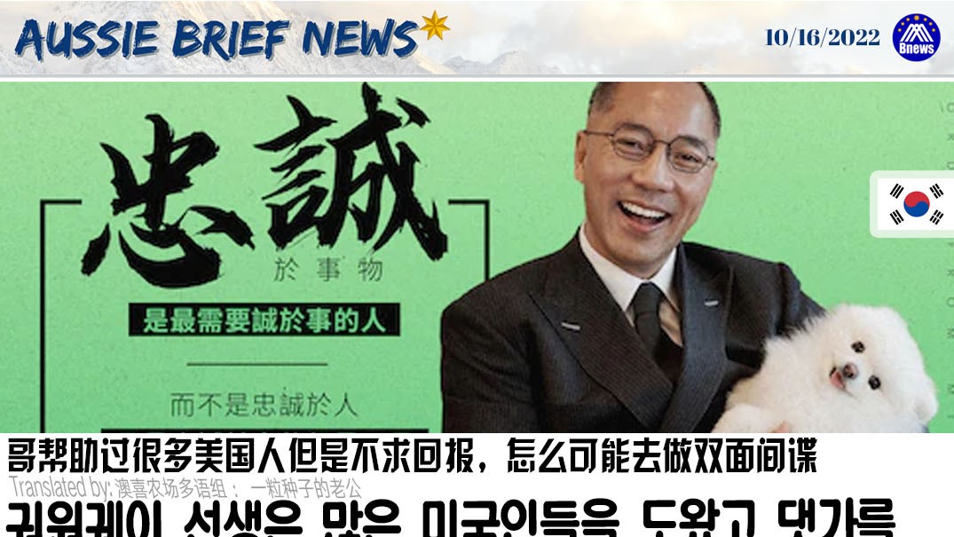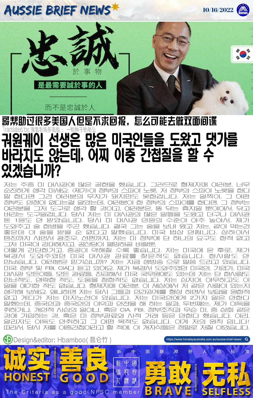 이렇게 간단한거고, 중공이 약해질 수록 좋습니다. 저는 미국에 온 후로, 제가 북경서 도와주었던 미국 대사관 관료를 찾은적도 없습니다. 한사람도 안 만났습니다. 여러분은 믿기십니까? 저는 지금 생방송 으로 말씀 드리고 있습니다. 미국 정부 및 FBI, CIA다 듣고 있어요. 제가 북경서 도와주었던 미국인, 기업가, 미국 대사관 모든이들, 모든 관료들, 진급해서 미국 국무원에도 있는데 저는 단 한사람도 만난적도, 연락한 적도, 도움을 청한적도 없습니다. 저는 심지어, 아무하고도 이 일을 얘기한 적도 없습니다. 형제자매 여러분, 이 세상에서 저 같은 사람이 있는지 생각해 보세요. 왜냐하면 저는 당시 그들과 인간관계를 형성 하면서 보답을 원한적 없고 게다가 저는 마지노선이 있습니다. 저는 미국인에게 2가지 일은 안한다 말했는데, 중국인과 중국인의 이익과 안전을 해 하는 일과, 두번째는, 제가 이득을 취하거나, 개인적 사심의 일이나, 혹은 CIA, FBI, 정부조직과 무슨 미, 중 상회 같은 것에 가입하는 것, 혹은 미 정부관료와 사적 거래 등은 안한다 했습니다. 이리, 알리지도 이득도 안취하고 그 어떤 목적도 없습니다. 이게 저의 원칙 입니다! 따라서, 당시 저를 이중간첩이라고 할 적에, 이 개자식들은 정말로 저질 이었습니다.