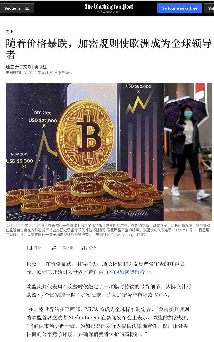 • 欧洲已制定法规,在监管加密货币方面引领世界潮流